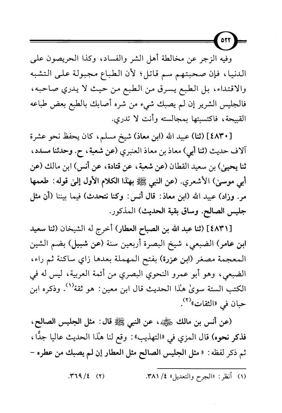 [4830] (ثنا) عبيد اللَّه (ابن معاذ) شيخ مسلم، كان يحفظ نحو عشرة آلاف حديث (ثنا أبي) معاذ بن معاذ العنبري (عن شعبة، ح. وحدثنا مسدد، ثنا يحيى) بن سعيد القطان (عن شعبة، عن قتادة، عن أنس) ابن مالك (عن أبي موسى) الأشعري. (عن النبي -صلى اللَّه عليه وسلم- بهذا الكلام الأول إلى قوله: طعمها مر. وزاد) عبيد اللَّه (ابن معاذ: قال أنس: وكنا نتحدث) فيما بيننا (أن مثل جليس الصالح. وساق بقية الحديث) المذكور.