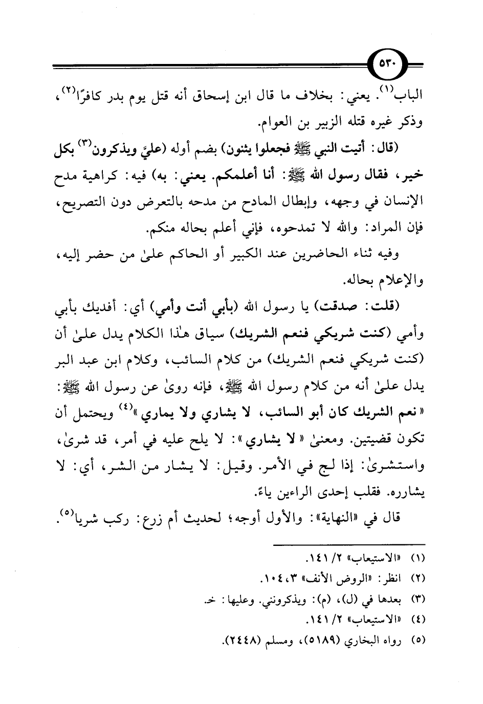 الباب (¬1). يعني: بخلاف ما قال ابن إسحاق أنه قتل يوم بدر كافرًا (¬2)، وذكر غيره قتله الزبير بن العوام.