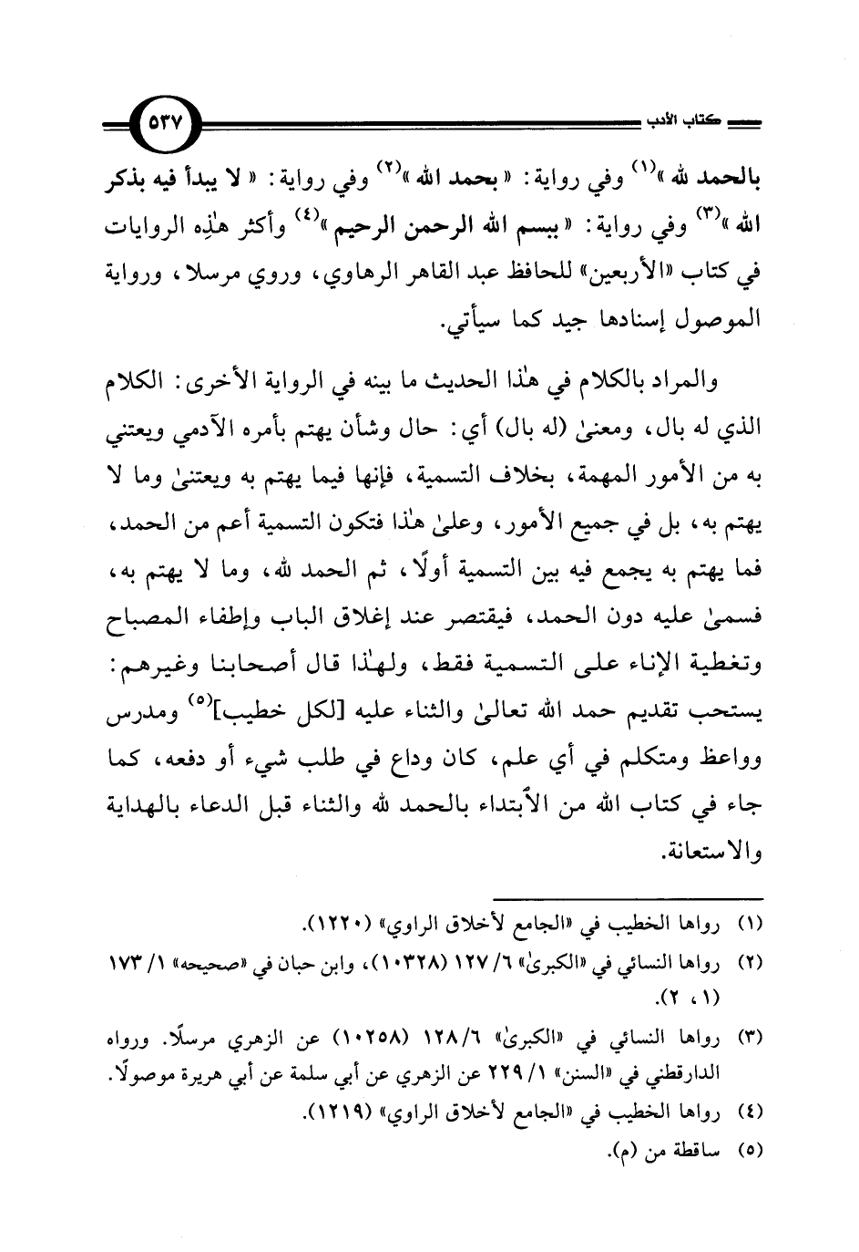 بالحمد للَّه" (¬1) وفي رواية: "بحمد اللَّه" (¬2) وفي رواية: "لا يبدأ فيه بذكر اللَّه" (¬3) وفي رواية: "ببسم اللَّه الرحمن الرحيم" (¬4) وأكثر هذِه الروايات في كتاب "الأربعين" للحافظ عبد القاهر الرهاوي، وروي مرسلا، ورواية الموصول إسنادها جيد كما سيأتي.