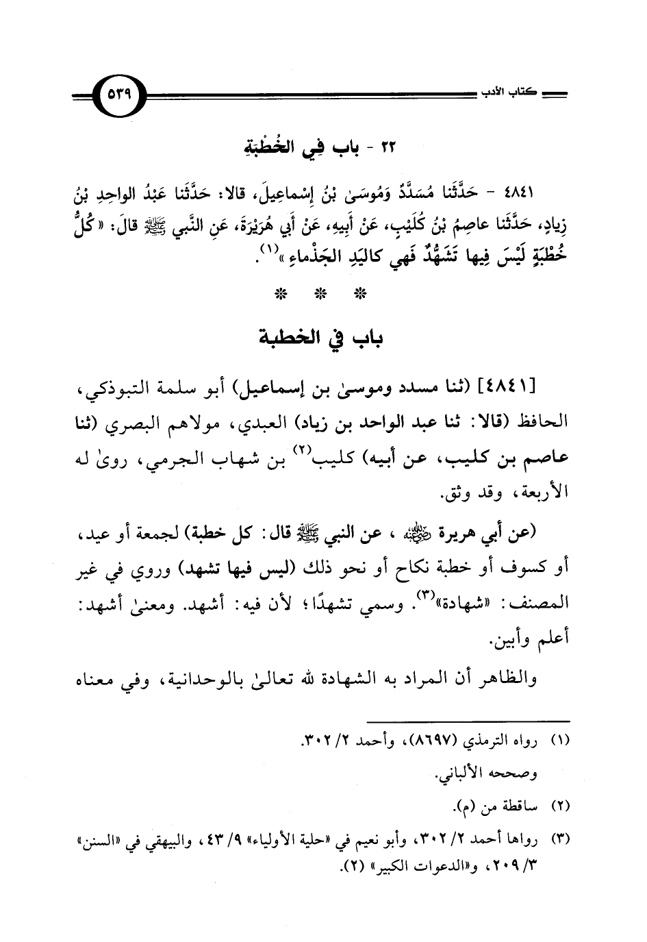 [4841] (ثنا مسدد وموسى بن إسماعيل) أبو سلمة التبوذكي، الحافظ (قالا: ثنا عبد الواحد بن زياد) العبدي، مولاهم البصري (ثنا عاصم بن كليب، عن أبيه) كليب (¬2) بن شهاب الجرمي، روى له الأربعة، وقد وثق.