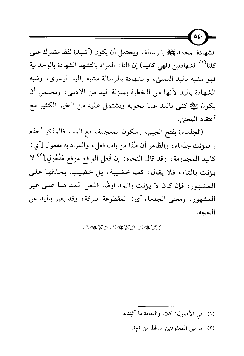 (الجذماء) بفتح الجيم، وسكون المعجمة، مع المد، فالمذكر أجذم والمؤنث جذماء، والظاهر أن هذا من باب فعل، والمراد به مفعول [أي: كاليد المجذومة، وقد قال النحاة: إن فَعل الواقع موقع مَفْعُولٍ] (¬2) لا يؤنث بالتاء، فلا يقال: كف خضيبة، بل خضيب. بحذفها على المشهور، فإن كان لا يؤنث بالمد أيضًا فلعل المد هنا على غير المشهور، ومعنى الجذماء أي: المقطوعة البركة، وقد يعبر باليد عن الحجة.