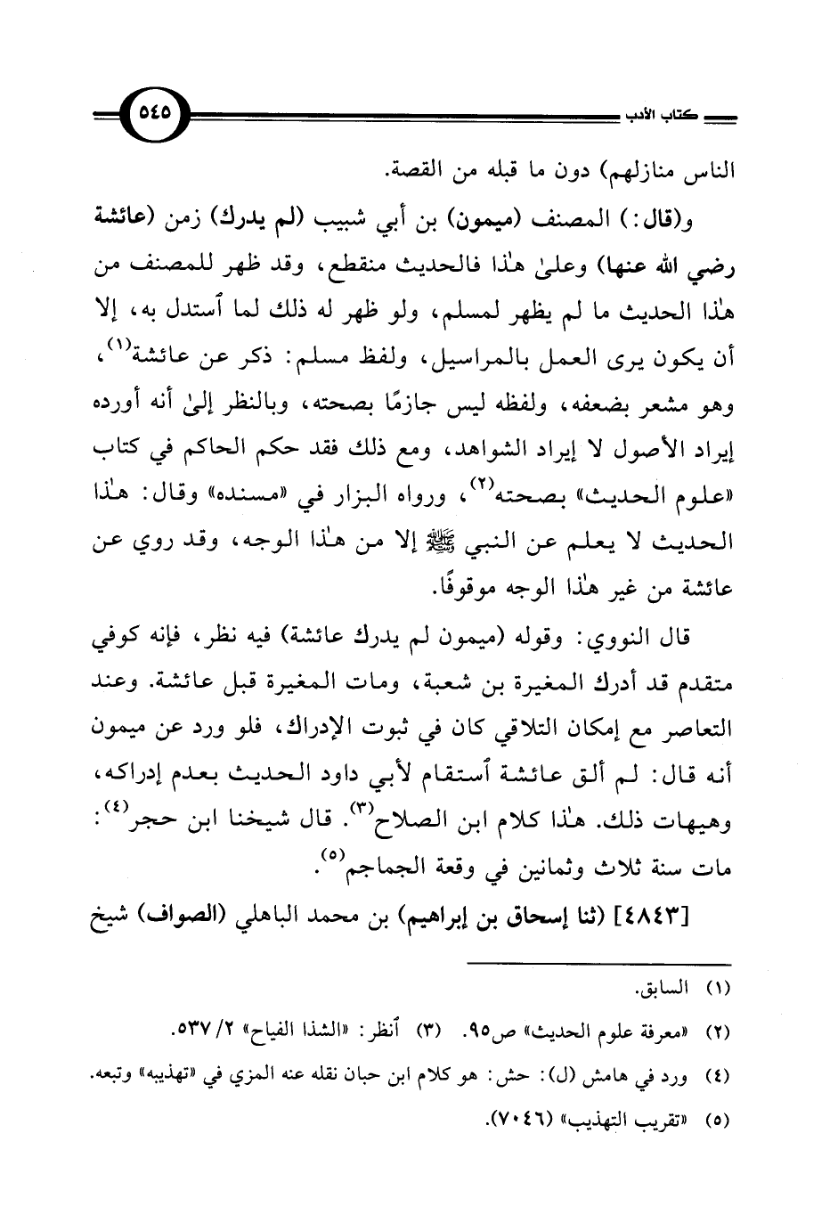 قال النووي: وقوله (ميمون لم يدرك عائشة) فيه نظر، فإنه كوفي متقدم قد أدرك المغيرة بن شعبة، ومات المغيرة قبل عائشة. وعند التعاصر مع إمكان التلاقي كان في ثبوت الإدراك، فلو ورد عن ميمون أنه قال: لم ألق عائشة استقام لأبي داود الحديث بعدم إدراكه، وهيهات ذلك. هذا كلام ابن الصلاح (¬3). قال شيخنا ابن حجر (¬4): مات سنة ثلاث وثمانين في وقعة الجماجم (¬5).