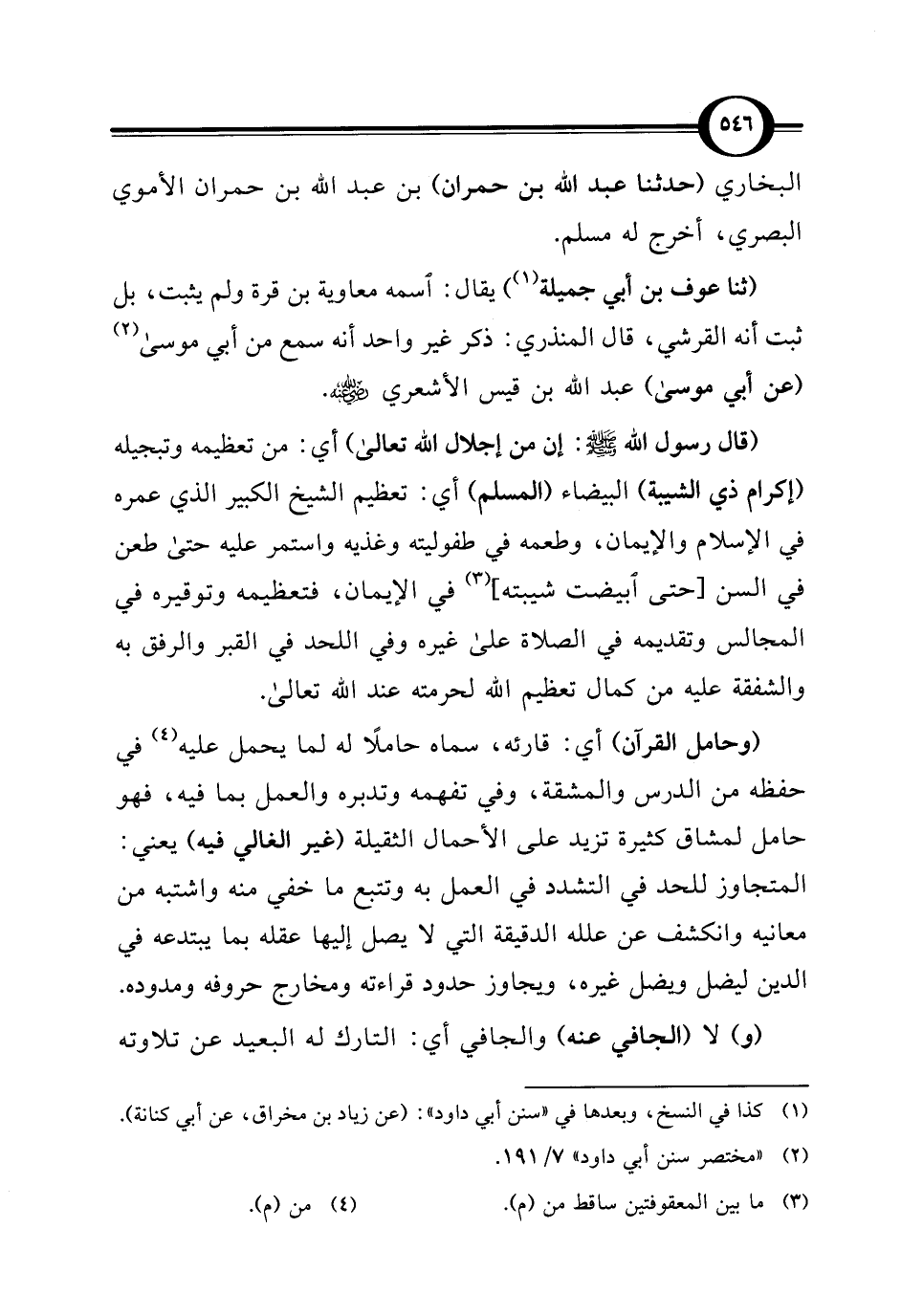 (وحامل القرآن) أي: قارئه، سماه حاملًا له لما يحمل عليه (¬4) في حفظه من الدرس والمشقة، وفي تفهمه وتدبره والعمل بما فيه، فهو حامل لمشاق كثيرة تزيد على الأحمال الثقيلة (غير الغالي فيه) يعني: المتجاوز للحد في التشدد في العمل به وتتبع ما خفي منه واشتبه من معانيه وانكشف عن علله الدقيقة التي لا يصل إليها عقله بما يبتدعه في الدين ليضل ويضل غيره، ويجاوز حدود قراءته ومخارج حروفه ومدوده.