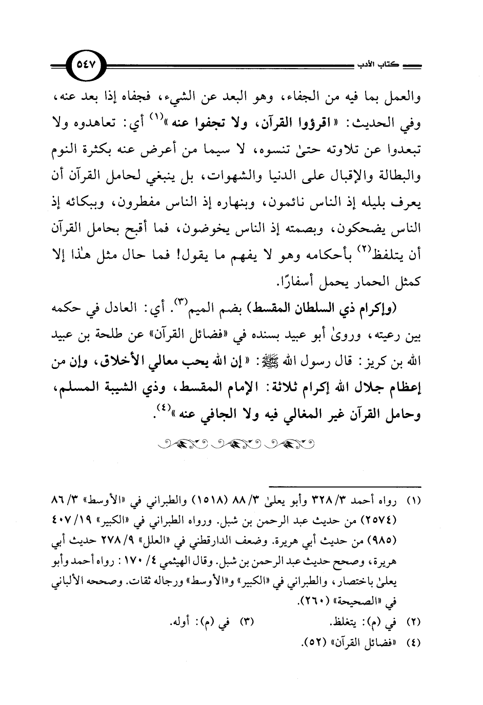 والعمل بما فيه من الجفاء، وهو البعد عن الشيء، فجفاه إذا بعد عنه، وفي الحديث: "اقرؤوا القرآن، ولا تجفوا عنه" (¬1) أي: تعاهدوه ولا تبعدوا عن تلاوته حتى تنسوه، لا سيما من أعرض عنه بكثرة النوم والبطالة والإقبال على الدنيا والشهوات، بل ينبغي لحامل القرآن أن يعرف بليله إذ الناس نائمون، وبنهاره إذ الناس مفطرون، وببكائه إذ الناس يضحكون، وبصمته إذ الناس يخوضون، فما أقبح بحامل القرآن أن يتلفظ (¬2) بأحكامه وهو لا يفهم ما يقول! فما حال مثل هذا إلا كمثل الحمار يحمل أسفارًا.