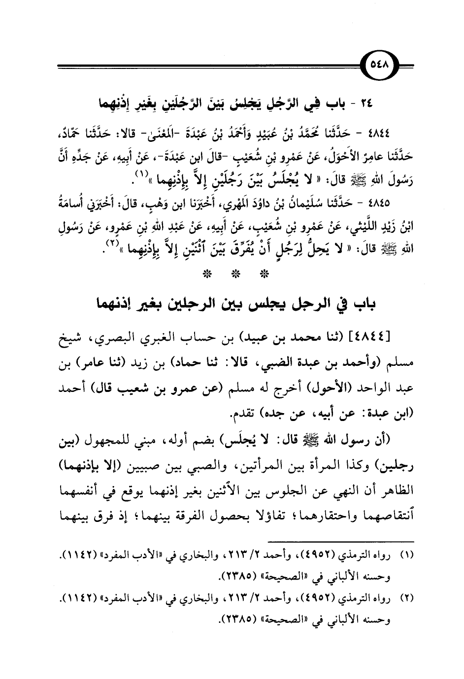 (أن رسول اللَّه -صلى اللَّه عليه وسلم- قال: لا يُجلَس) بضم أوله، مبني للمجهول (بين رجلين) وكذا المرأة بين المرأتين، والصبي بين صبيين (إلا بإذنهما) الظاهر أن النهي عن الجلوس بين الاثنين بغير إذنهما يوقع في أنفسهما انتقاصهما واحتقارهما؛ تفاؤلا بحصول الفرقة بينهما، إذ فرق بينهما