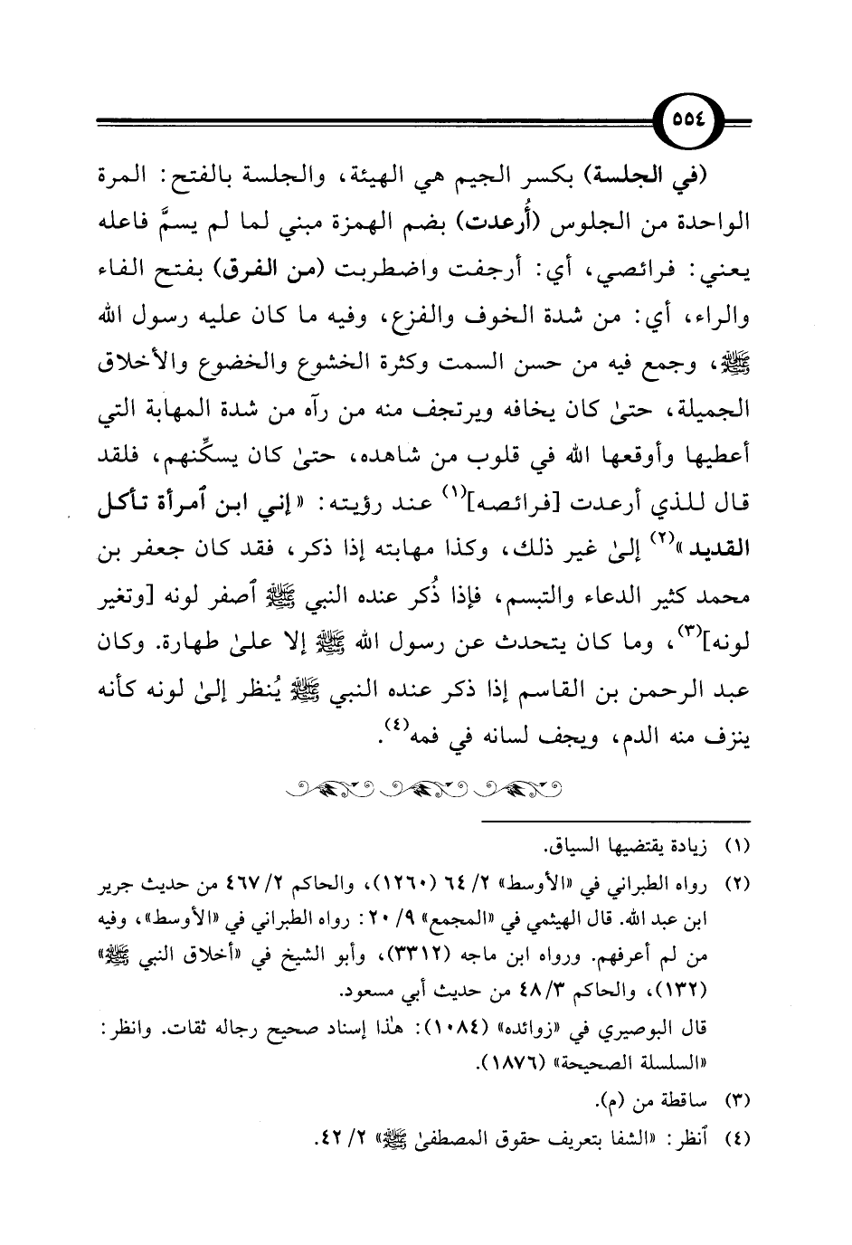(في الجلسة) بكسر الجيم هي الهيئة، والجلسة بالفتح: المرة الواحدة من الجلوس (أُرعدت) بضم الهمزة مبني لما لم يسمَّ فاعله يعني: فرائصي، أي: أرجفت واضطربت (من الفرق) بفتح الفاء والراء، أي: من شدة الخوف والفزع، وفيه ما كان عليه رسول اللَّه -صلى اللَّه عليه وسلم-، وجمع فيه من حسن السمت وكثرة الخشوع والخضوع والأخلاق الجميلة، حتى كان يخافه ويرتجف منه من رآه من شدة المهابة التي أعطيها وأوقعها اللَّه في قلوب من شاهده، حتى كان يسكِّنهم، فلقد قال للذي أرعدت [فرائصه] (¬1) عند رؤيته: "إني ابن امرأة تأكل القديد" (¬2) إلى غير ذلك، وكذا مهابته إذا ذكر، فقد كان جعفر بن محمد كثير الدعاء والتبسم، فإذا ذُكر عنده النبي -صلى اللَّه عليه وسلم- اصفر لونه [وتغير لونه] (¬3)، وما كان يتحدث عن رسول اللَّه -صلى اللَّه عليه وسلم- إلا على طهارة. وكان عبد الرحمن بن القاسم إذا ذكر عنده النبي -صلى اللَّه عليه وسلم- يُنظر إلى لونه كأنه ينزف منه الدم، ويجف لسانه في فمه (¬4).