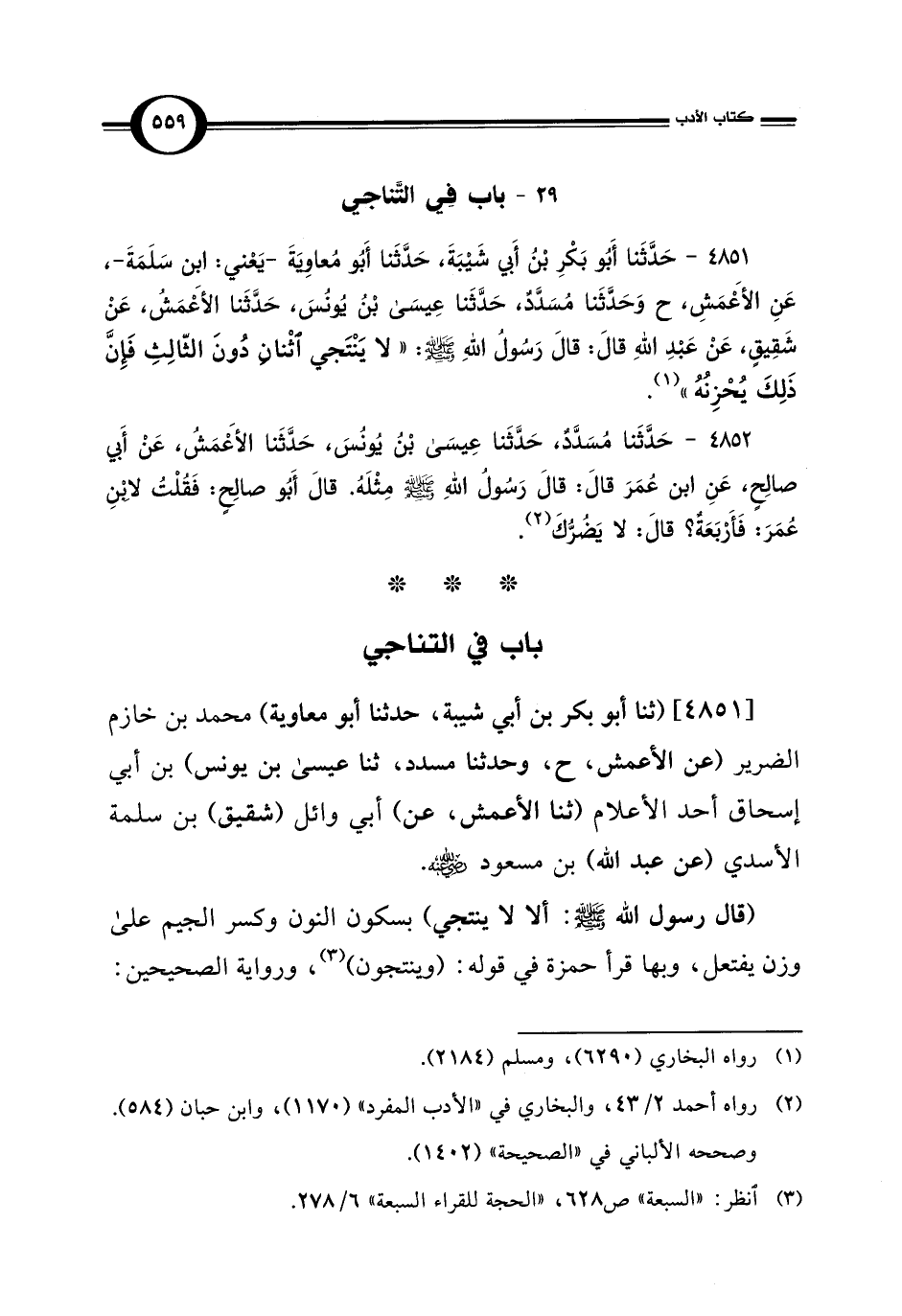 [4851] (ثنا أبو بكر بن أبي شيبة، حدثنا أبو معاوية) محمد بن خازم الضرير (عن الأعمش، ح، وحدثنا مسدد، ثنا عيسى بن يونس) بن أبي إسحاق أحد الأعلام (ثنا الأعمش، عن) أبي وائل (شقيق) بن سلمة الأسدي (عن عبد اللَّه) بن مسعود -رضي اللَّه عنه-.