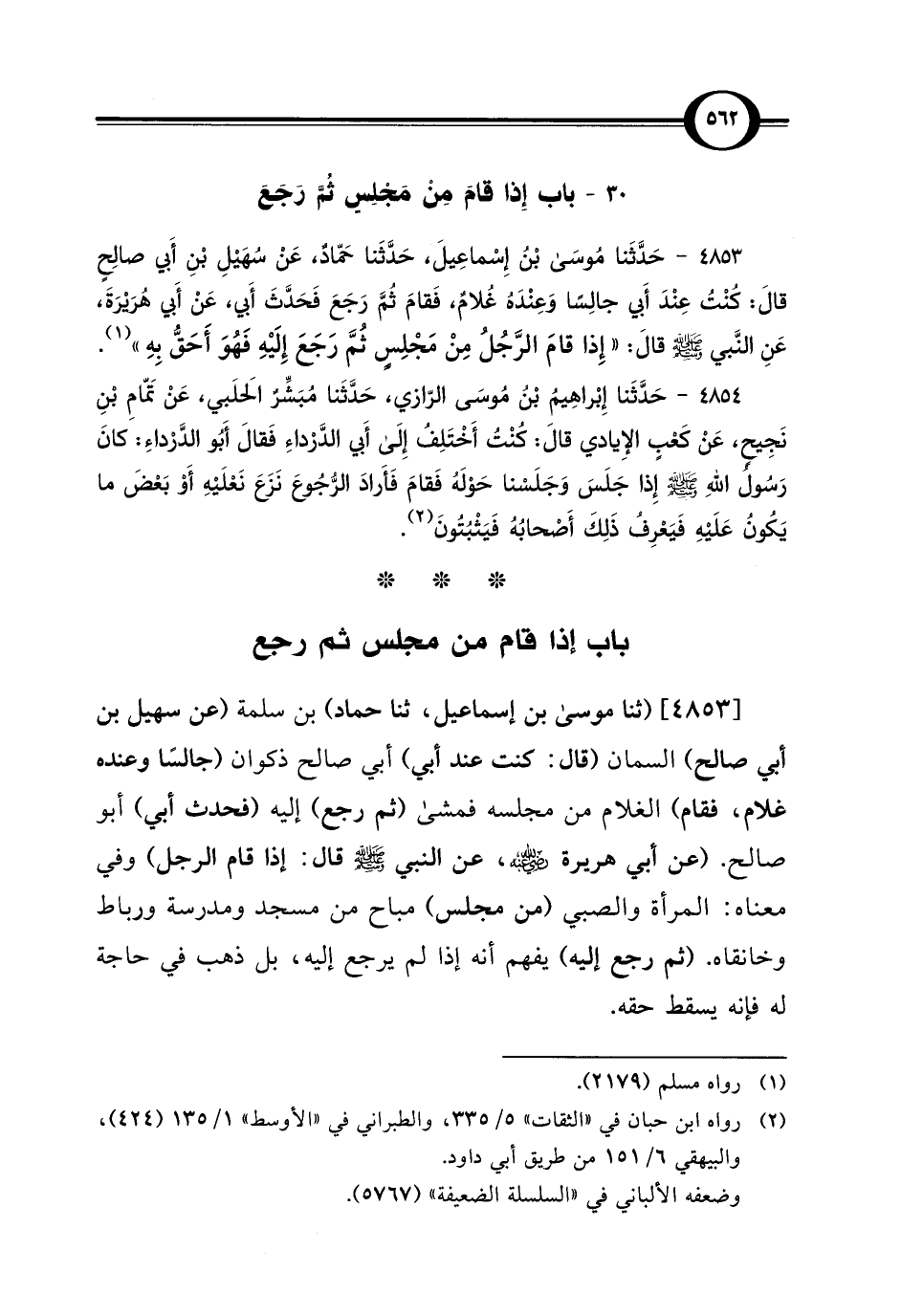 [4853] (ثنا موسى بن إسماعيل، ثنا حماد) بن سلمة (عن سهيل بن أبي صالح) السمان (قال: كنت عند أبي) أبي صالح ذكوان (جالسًا وعنده غلام، فقام) الغلام من مجلسه فمشى (ثم رجع) إليه (فحدث أبي) أبو صالح. (عن أبي هريرة -رضي اللَّه عنه-، عن النبي -صلى اللَّه عليه وسلم- قال: إذا قام الرجل) وفي معناه: المرأة والصبي (من مجلس) مباح من مسجد ومدرسة ورباط وخانقاه. (ثم رجع إليه) يفهم أنه إذا لم يرجع إليه، بل ذهب في حاجة له فإنه يسقط حقه.