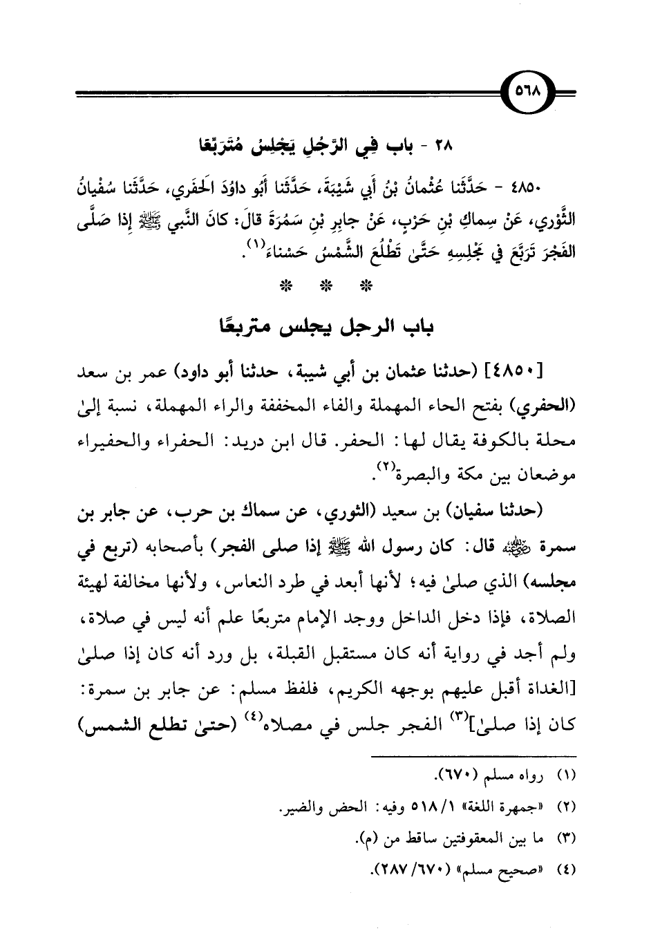 [4850] (حدثنا عثمان بن أبي شيبة، حدثنا أبو داود) عمر بن سعد (الحفري) بفتح الحاء المهملة والفاء المخففة والراء المهملة، نسبة إلى محلة بالكوفة يقال لها: الحفر. قال ابن دريد: الحفراء والحفيراء موضعان بين مكة والبصرة (¬2).