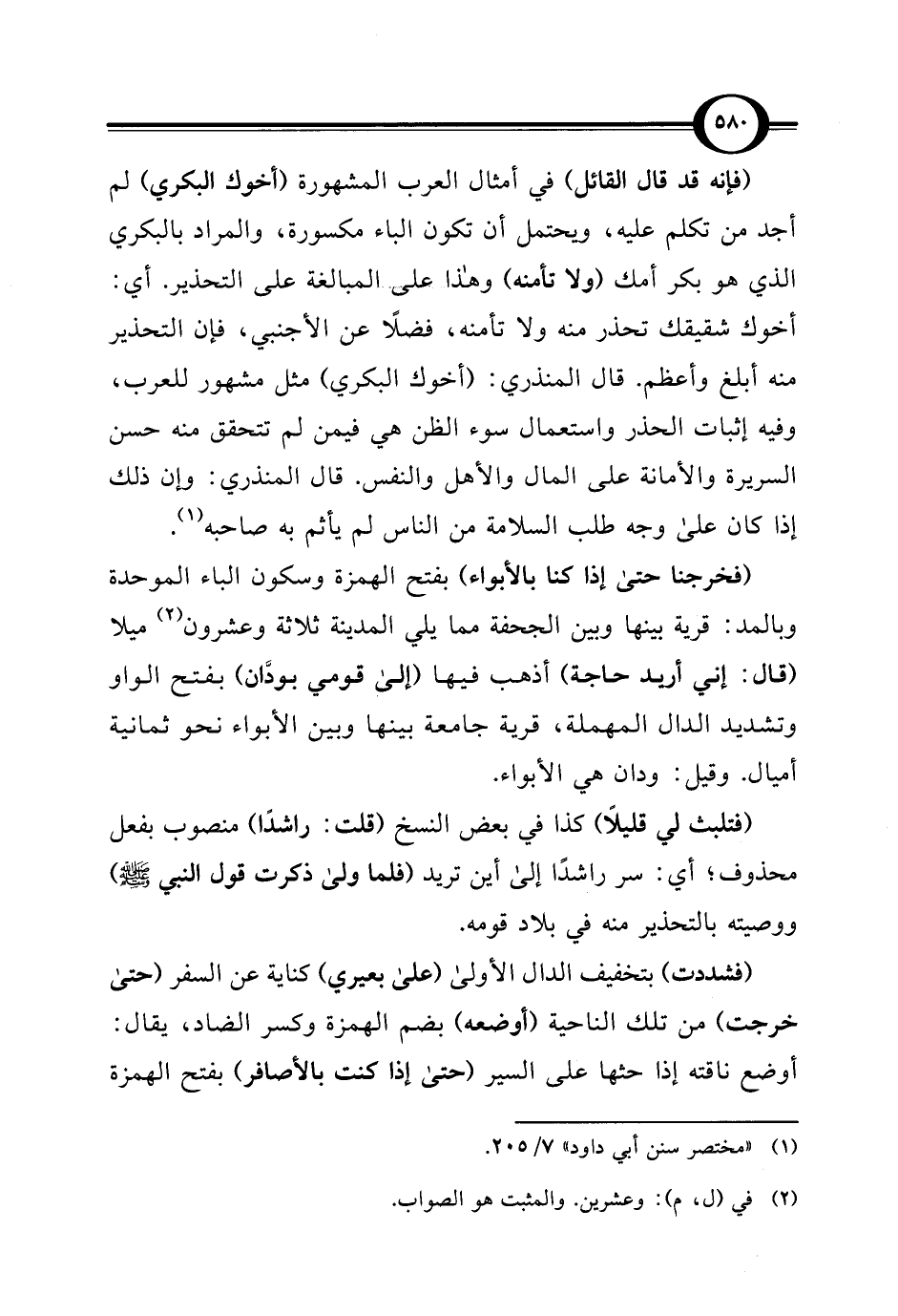 (فشددت) بتخفيف الدال الأولى (على بعيري) كناية عن السفر (حتى خرجت) من تلك الناحية (أوضعه) بضم الهمزة وكسر الضاد، يقال: أوضع ناقته إذا حثها على السير (حتى إذا كنت بالأصافر) بفتح الهمزة
