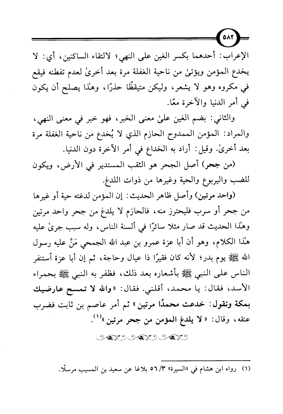 (واحد مرتين) وأصل ظاهر الحديث: إن المؤمن لدغته حية أو غيرها من جحر أو سرب فليحترز منه، فالحازم لا يلدغ من جحر واحد مرتين وهذا الحديث قد صار مثلا سائرًا في ألسنة الناس، وله سبب جرى عليه هذا الكلام، وهو أن أبا عزة عمرو بن عبد اللَّه الجمحي مَنَّ عليه رسول اللَّه -صلى اللَّه عليه وسلم- يوم بدر، لأنه كان فقيرًا ذا عيال وحاجة، ثم إن أبا عزة استنفر الناس على النبي -صلى اللَّه عليه وسلم- بأشعاره بعد ذلك، فظفر به النبي -صلى اللَّه عليه وسلم- بحمراء الأسد، فقال: يا محمد، أقلني. فقال: "واللَّه لا تمسح عارضيك بمكة وتقول: خدعت محمدًا مرتين" ثم أمر عاصم بن ثابت فضرب عنقه، وقال: "لا يلدغ المؤمن من جحر مرتين" (¬1).