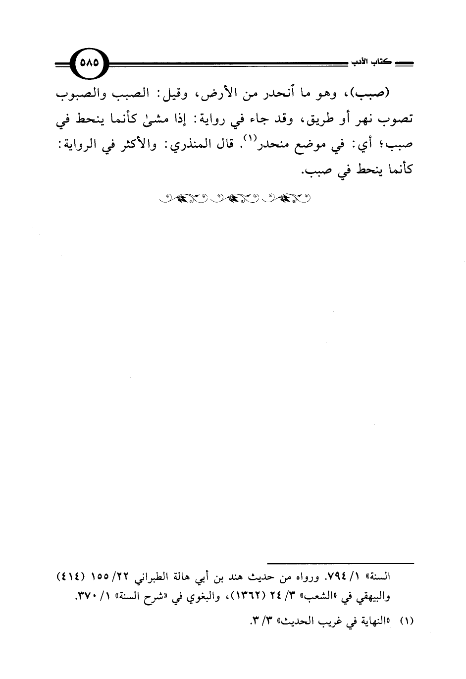 (صبب)، وهو ما انحدر من الأرض، وقيل: الصبب والصبوب تصوب نهر أو طريق، وقد جاء في رواية: إذا مشى كأنما ينحط في صبب؛ أي: في موضع منحدر (¬1). قال المنذري: والأكثر في الرواية: كأنما ينحط في صبب.