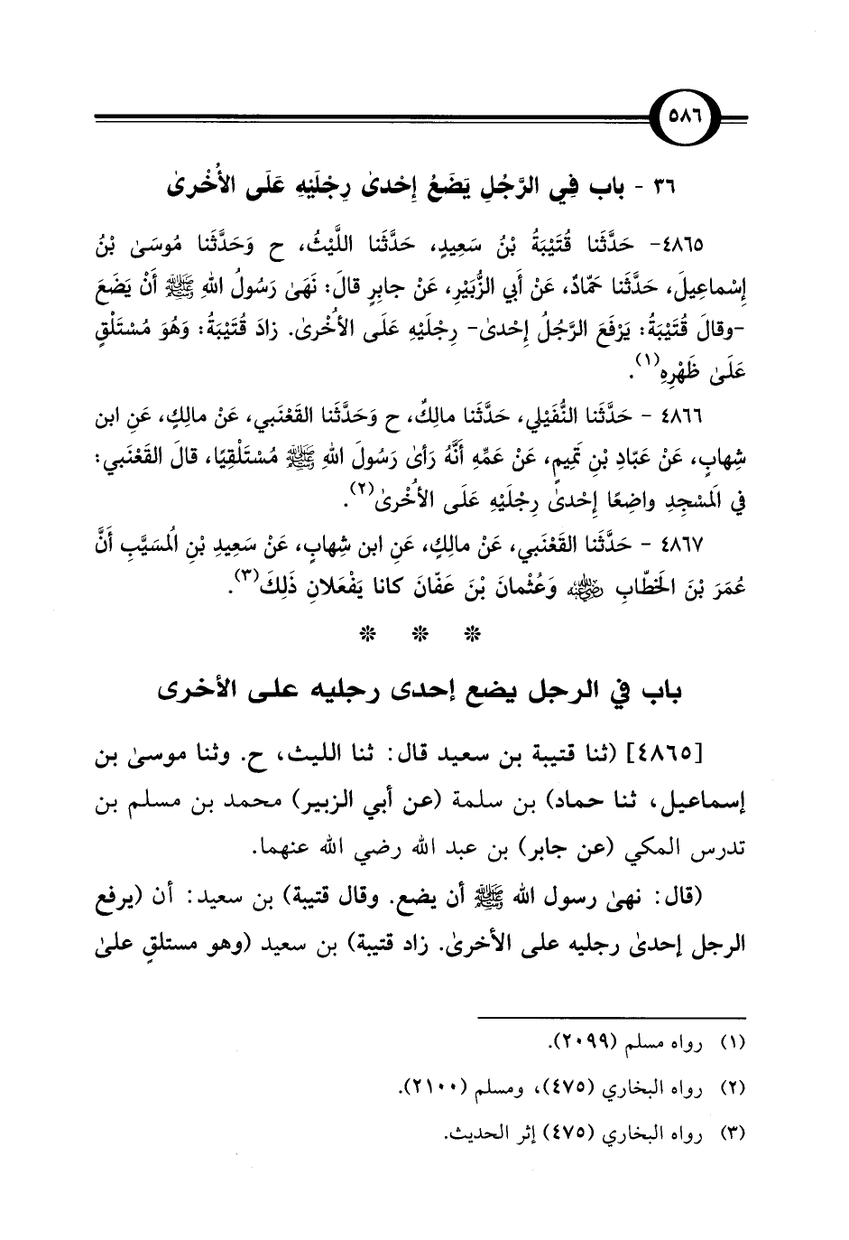 (قال: نهى رسول اللَّه -صلى اللَّه عليه وسلم- أن يضع. وقال قتيبة) بن سعيد: أن (يرفع الرجل إحدى رجليه على الأخرى. زاد قتيبة) بن سعيد (وهو مستلقٍ على