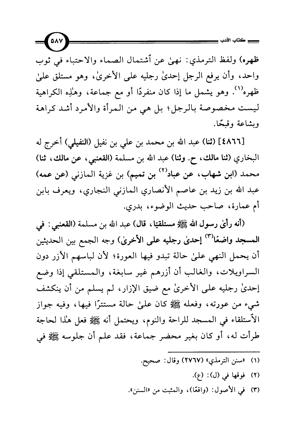 ظهره) ولفظ الترمذي: نهى عن اشتمال الصماء والاحتباء في ثوب واحد، وأن يرفع الرجل إحدى رجليه على الأخرى، وهو مستلق على ظهره (¬1). وهو يشمل ما إذا كان منفردا أو مع جماعة، وهذِه الكراهية ليست مخصوصة بالرجل؛ بل هي من المرأة والأمرد أشد كراهة وبشاعة وقبحًا.