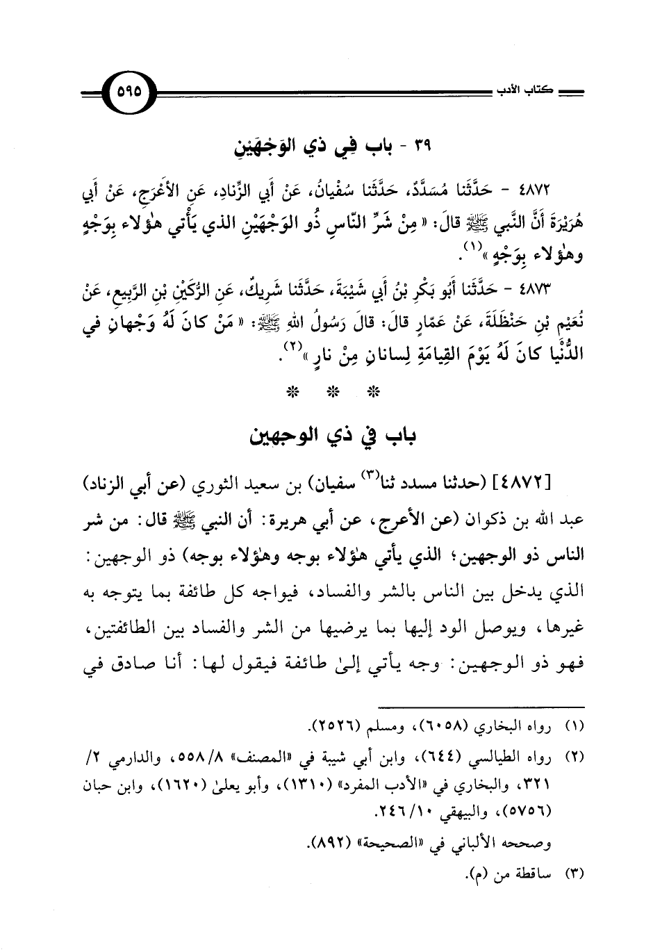 [4872] (حدثنا مسدد ثنا (¬3) سفيان) بن سعيد الثوري (عن أبي الزناد) عبد اللَّه بن ذكوان (عن الأعرج، عن أبي هريرة: أن النبي -صلى اللَّه عليه وسلم- قال: من شر الناس ذو الوجهين؛ الذي يأتي هؤلاء بوجه وهؤلاء بوجه) ذو الوجهين: الذي يدخل بين الناس بالشر والفساد، فيواجه كل طائفة بما يتوجه به غيرها، ويوصل الود إليها بما يرضيها من الشر والفساد بين الطائفتين، فهو ذو الوجهين: وجه يأتي إلى طائفة فيقول لها: أنا صادق في