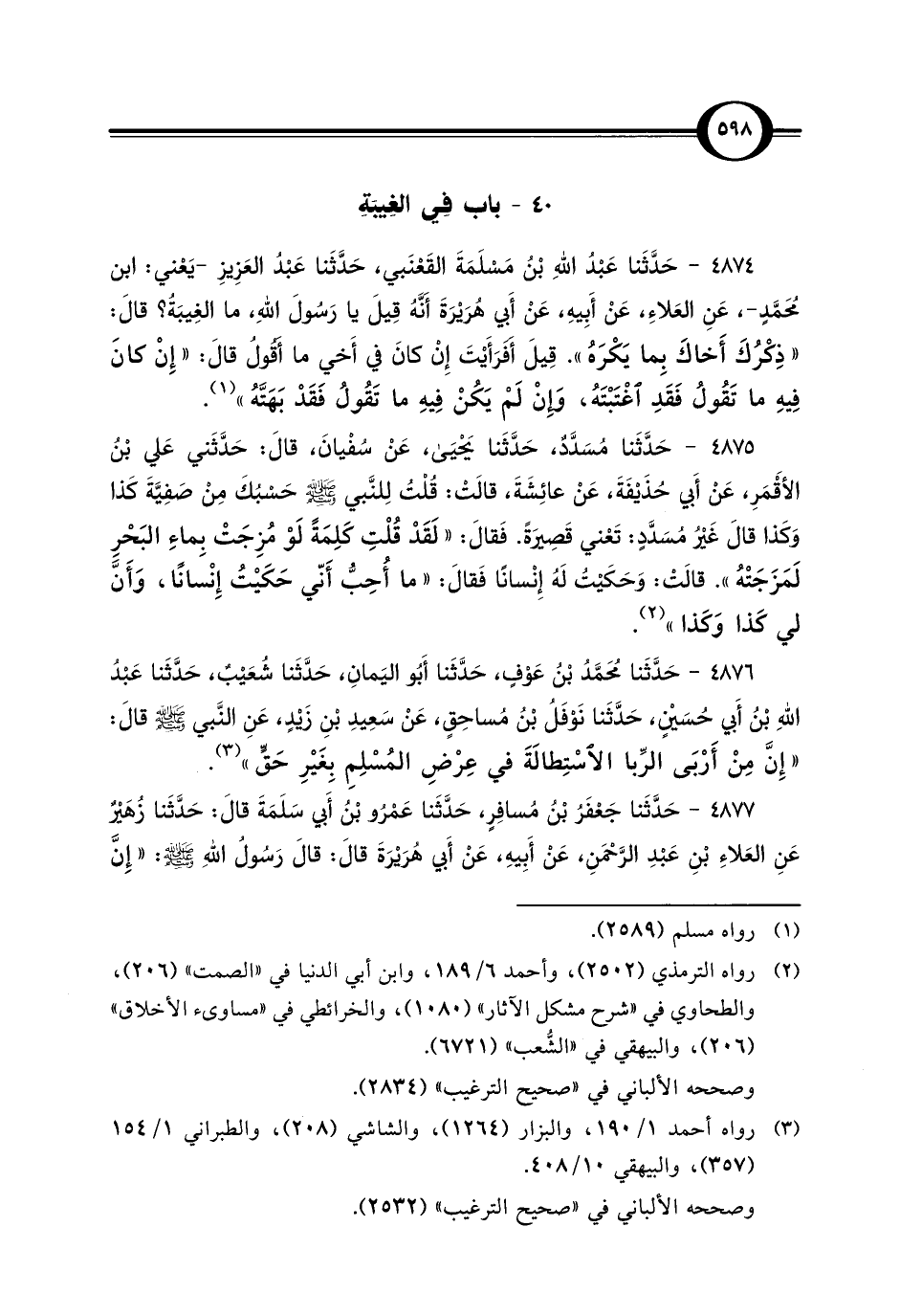 4874 - حَدَّثَنا عَبْدُ اللَّهِ بْنُ مَسْلَمَةَ القَعْنَبي، حَدَّثَنا عَبْدُ العَزِيزِ -يَعْني: ابن مُحَمَّدٍ-، عَنِ العَلاءِ، عَنْ أَبِيهِ، عَنْ أَبِي هُرَيْرَةَ أَنَّهُ قِيلَ يا رَسُولَ اللَّهِ، ما الغِيبَةُ؟ قالَ: "ذِكْرُكَ أَخاكَ بِما يَكْرَهُ". قِيلَ أَفرَأَيْتَ إِنْ كانَ في أَخي ما أَقُولُ قالَ: "إِنْ كانَ فِيهِ ما تَقُولُ فَقَدِ اغْتَبْتَهُ، وَإِنْ لَمْ يَكُنْ فِيهِ ما تَقُولُ فَقَدْ بَهَتَّهُ" (¬1).