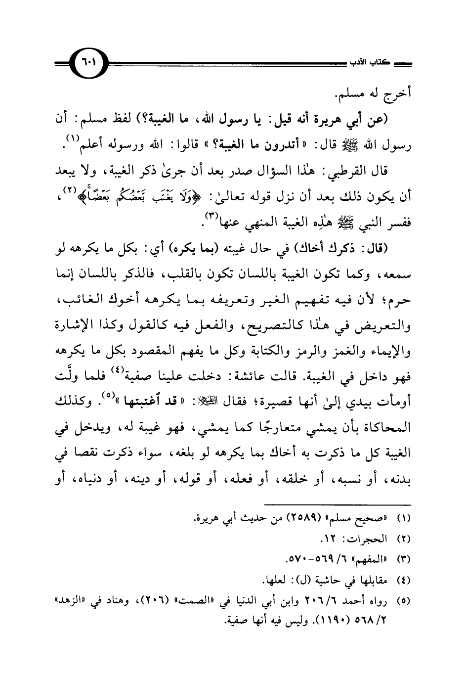 قال القرطبي: هذا السؤال صدر بعد أن جرى ذكر الغيبة، ولا يبعد أن يكون ذلك بعد أن نزل قوله تعالى: {وَلَا يَغْتَبْ بَعْضُكُمْ بَعْضًا} (¬2)، ففسر النبي -صلى اللَّه عليه وسلم- هذِه الغيبة المنهي عنها (¬3).
