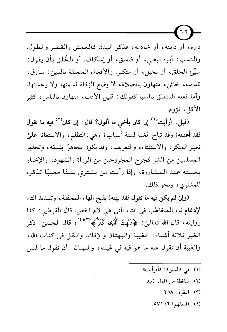 (قيل: أرأيت (¬1) إن كان بأخي ما أقول؟ قال: إن كان (¬2) فيه ما تقول فقد اغتبته) وقد تباح الغيبة لستة أسباب؛ وهي: التظلم، والاستعانة على تغيير المنكر، والاستفتاء، والتعريف، وقد يكون مجاهرًا بفسقه، وتحذير المسلمين من الشر كجرح المجروحين من الرواة والشهود، والإخبار بغيبته عند المشاورة، وإذا رأيت من يشتري شيئًا معيبًا تذكره للمشتري، ونحو ذلك.