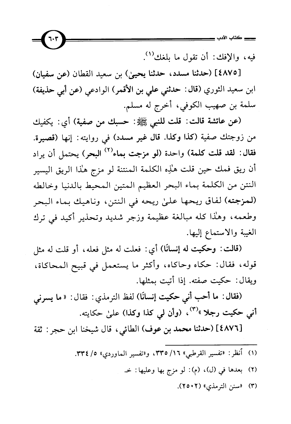 (عن عائشة قالت: قلت للنبي -صلى اللَّه عليه وسلم-: حسبك من صفية) أي: يكفيك من زوجتك صفية (كذا وكذا. قال غير مسدد) في روايته: إنها (قصيرة. فقال: لقد قلت كلمة) واحدة (لو مزجت بماء (¬2) البحر) يحتمل أن يراد أن ريق فمك حين قلت هذِه الكلمة المنتنة لو مزج هذا الريق اليسير النتن من الكلمة بماء البحر العظيم المتين المحيط بالدنيا وخالطه (لمزجته) لفاق ريحها على ريحه في النتن، وناهيك بماء البحر وطعمه، وهذا كله مبالغة عظيمة وزجر شديد وتحذير أكيد في ترك الغيبة والاستماع إليها.