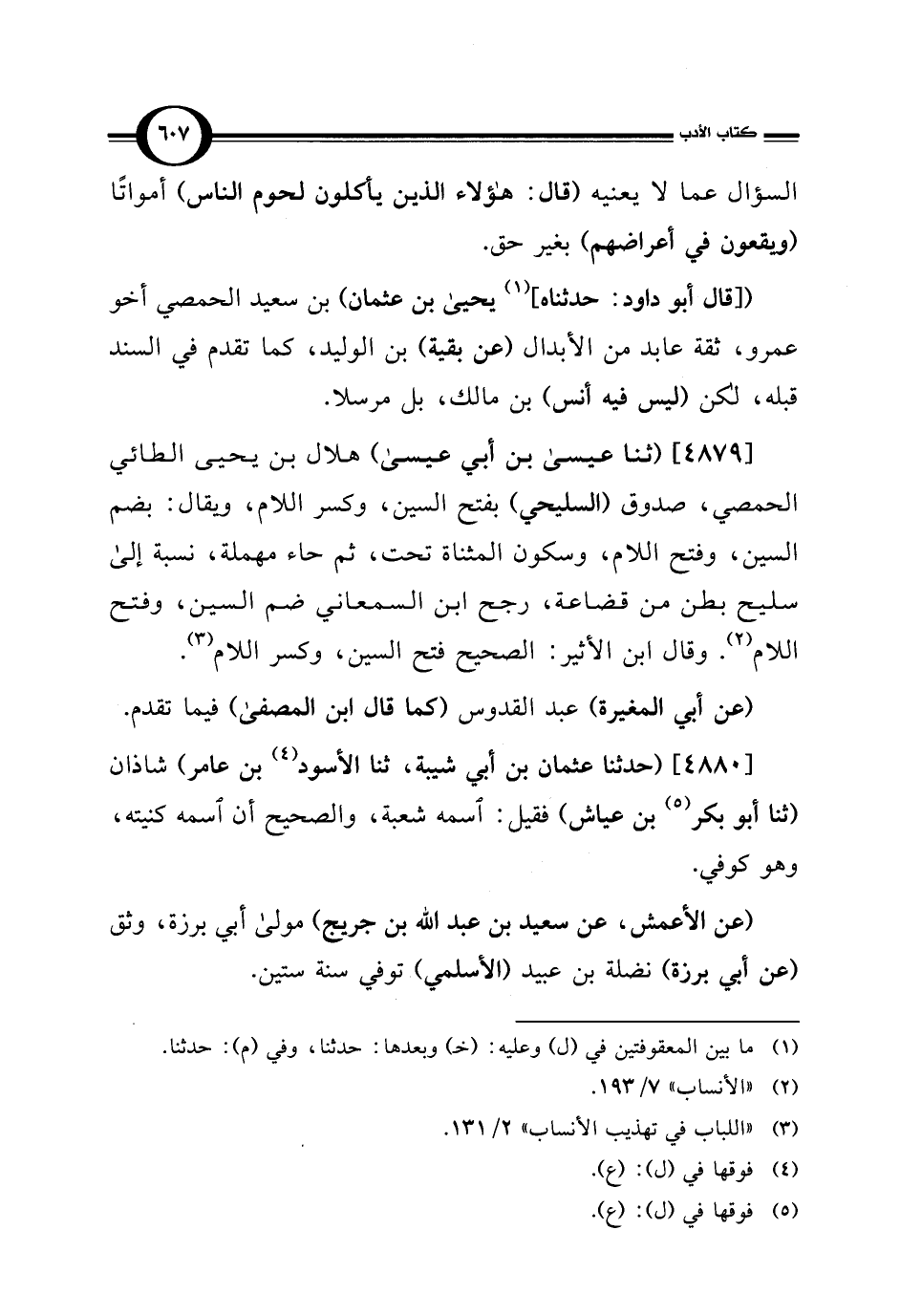 [4879] (ثنا عيسى بن أبي عيسى) هلال بن يحيى الطائي الحمصي، صدوق (السليحي) بفتح السين، وكسر اللام، ويقال: بضم السين، وفتح اللام، وسكون المثناة تحت، ثم حاء مهملة، نسبة إلى سليح بطن من قضاعة، رجح ابن السمعاني ضم السين، وفتح اللام (¬2). وقال ابن الأثير: الصحيح فتح السين، وكسر اللام (¬3).