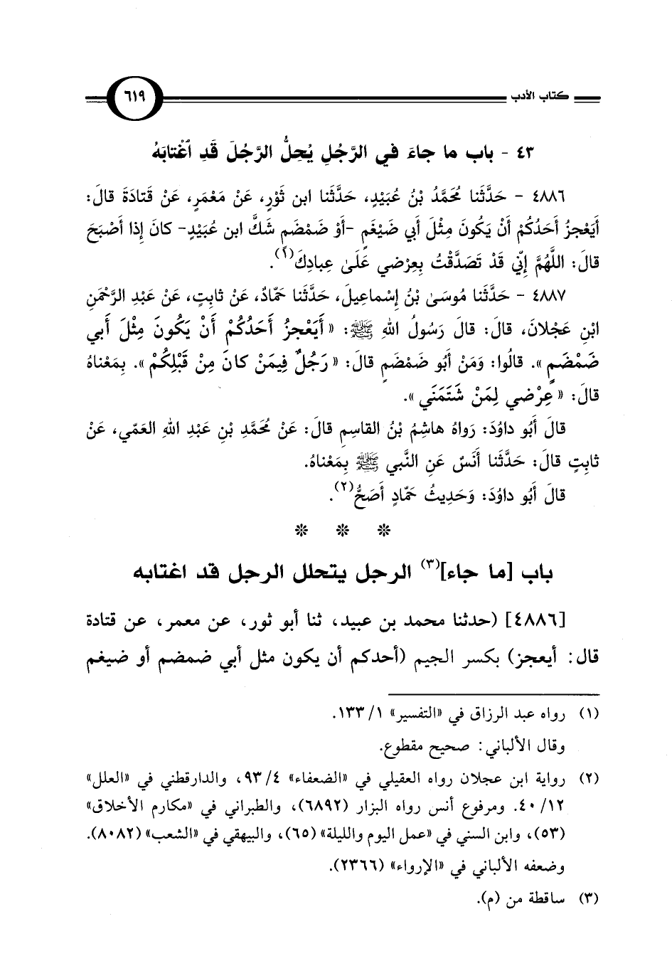 [4886] (حدثنا محمد بن عبيد، ثنا أبو ثور، عن معمر، عن قتادة قال: أيعجز) بكسر الجيم (أحدكم أن يكون مثل أبي ضمضم أو ضيغم