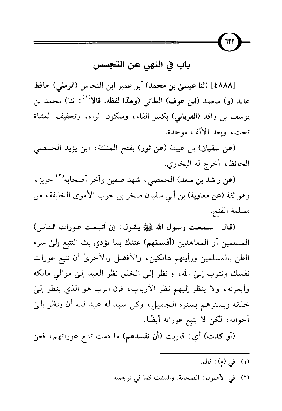 (قال: سمعت رسول اللَّه -صلى اللَّه عليه وسلم- يقول: إن اتبعت عورات الناس) المسلمين أو المعاهدين (أفسدتهم) عندك بما يؤدي بك التتبع إلى سوء الظن بالمسلمين ورأيتهم هالكين، والأفضل والأحرى أن تتبع عورات نفسك وتتوب إلى اللَّه، وانظر إلى الخلق نظر العبد إلى موالي مالكه وأبعرته، ولا ينظر إليهم نظر الأرباب، فإن الرب هو الذي ينظر إلى خلقه ويسترهم بستره الجميل، وكل سيد له عبد فله أن ينظر إلى أحواله، لكن لا يتبع عوراته أيضًا.
