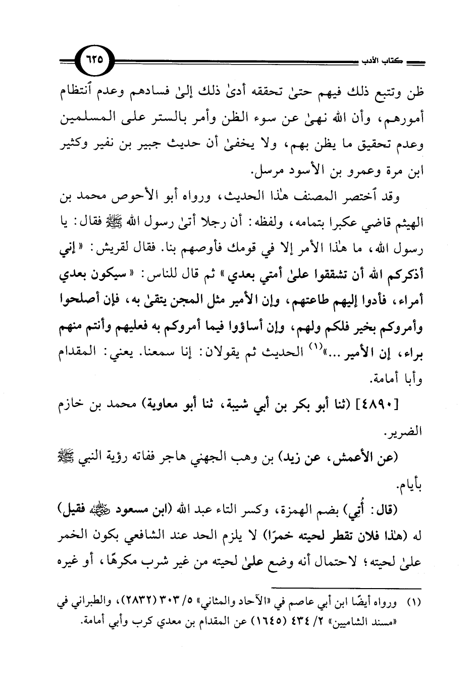 وقد اختصر المصنف هذا الحديث، ورواه أبو الأحوص محمد بن الهيثم قاضي عكبرا بتمامه، ولفظه: أن رجلا أتى رسول اللَّه -صلى اللَّه عليه وسلم- فقال: يا رسول اللَّه، ما هذا الأمر إلا في قومك فأوصهم بنا. فقال لقريش: "إني أذكركم اللَّه أن تشققوا على أمتي بعدي" ثم قال للناس: "سيكون بعدي أمراء، فأدوا إليهم طاعتهم، وإن الأمير مثل المجن يتقى به، فإن أصلحوا وأمروكم بخير فلكم ولهم، وإن أساؤوا فيما أمروكم به فعليهم وأنتم منهم براء، إن الأمير. . . " (¬1) الحديث ثم يقولان: إنا سمعنا. يعني: المقدام وأبا أمامة.