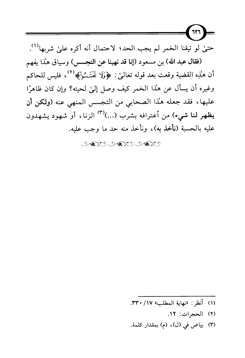 (فقال عبد اللَّه) بن مسعود (إنا قد نهينا عن التجسس) وسياق هذا يفهم أن هذِه القضية وقعت بعد قوله تعالى: {وَلَا تَجَسَّسُوا} (¬2)، فليس للحاكم وغيره أن يسأل عن هذا الخمر كيف وصل إلى لحيته؟ وإن كان ظاهرًا عليها، فقد جعله هذا الصحابي من التجسس المنهي عنه (ولكن أن يظهر لنا شيء) من اعترافه بشرب (. . .) (¬3) الزنا، أو شهود يشهدون عليه بالحسبة (نأخذ به)، ونأخذ منه حد ما وجب عليه.