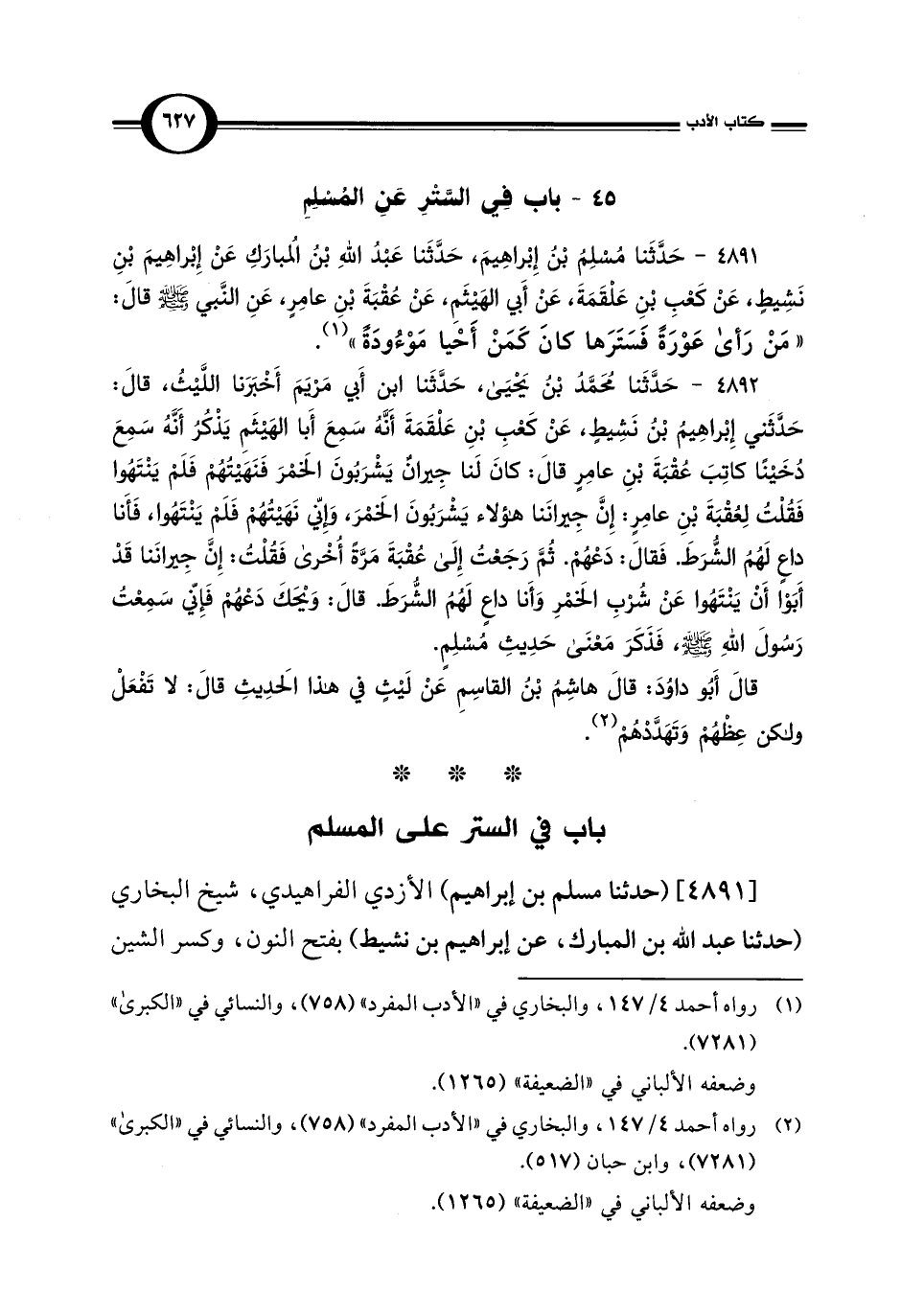 4891 - حَدَّثَنَا مُسْلِمٌ بْن إِبْراهِيمَ، حَدَّثَنَا عَبْدُ اللَّهِ بْنُ المُبَارَكِ عَنْ إِبْراهِيمَ بْنِ نَشِيطٍ، عَنْ كَعْبِ بْنِ عَلْقَمَةَ، عَن أَبِي الهَيْثَمِ، عَنْ عُقْبَةَ بْنِ عامِرٍ، عَنِ النَّبِيَّ -صلى اللَّه عليه وسلم- قالَ: "مَنْ رَأَى عَوْرَةً فَسَتَرَهَا كَانَ كَمَنْ أَحْيا مَوْءُودَةً" (¬1).