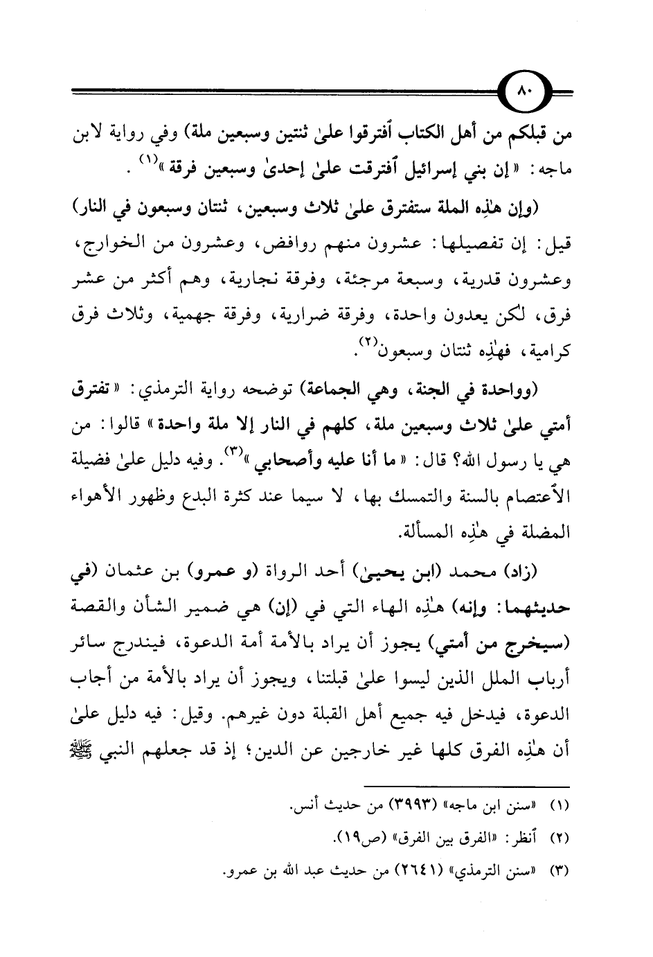 من قبلكم من أهل الكتاب افترقوا على ثنتين وسبعين ملة) وفي رواية لابن ماجه: "إن بني إسرائيل افترقت على إحدى وسبعين فرقة" (¬1).