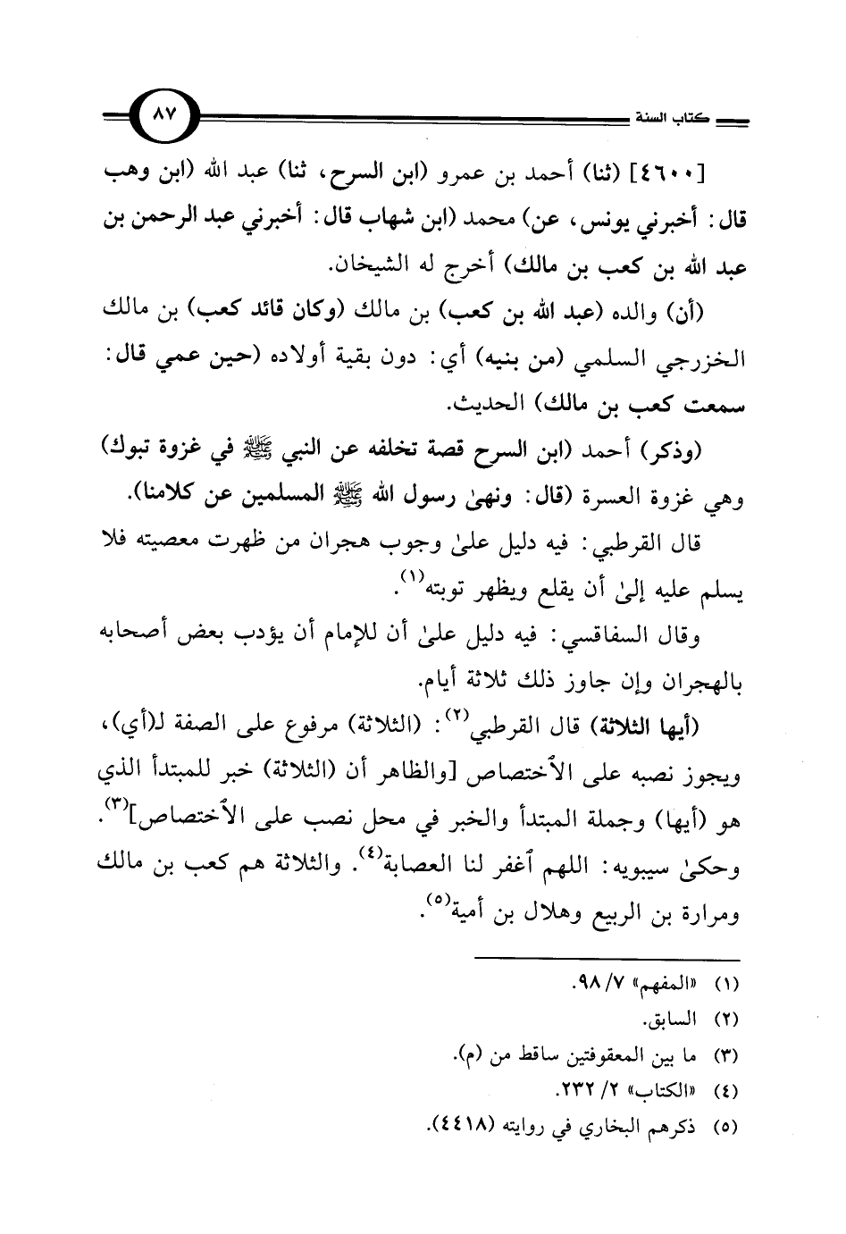 (أيها الثلاثة) قال القرطبي (¬2): (الثلاثة) مرفوع على الصفة و (أي)، ويجوز نصبه على الاختصاص [والظاهر أن (الثلاثة) خبر للمبتدأ الذي هو (أيها) وجملة المبتدأ والخبر في محل نصب على الاختصاص] (¬3). وحكى سيبويه: اللهم اغفر لنا العصابة (¬4). والثلاثة هم كعب بن مالك ومرارة بن الربيع وهلال بن أمية (¬5).