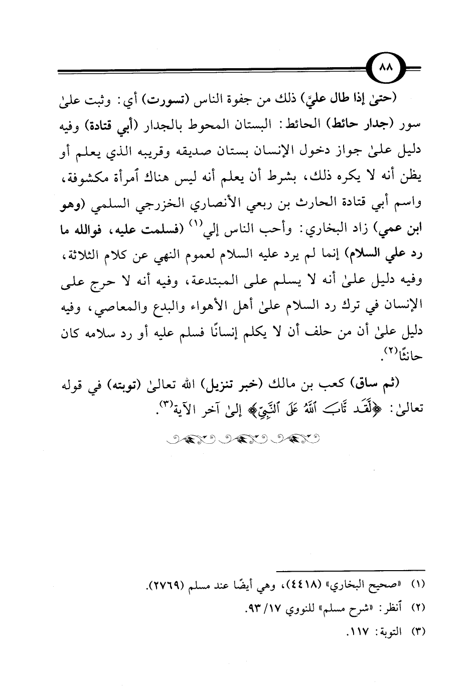 (حتى إذا طال عليَّ) ذلك من جفوة الناس (تسورت) أي: وثبت على سور (جدار حائط) الحائط: البستان المحوط بالجدار (أبي قتادة) وفيه دليل على جواز دخول الإنسان بستان صديقه وقريبه الذي يعلم أو يظن أنه لا يكره ذلك، بشرط أن يعلم أنه ليس هناك امرأة مكشوفة، واسم أبي قتادة الحارث بن ربعي الأنصاري الخزرجي السلمي (وهو ابن عمي) زاد البخاري: وأحب الناس إلي (¬1) (فسلمت عليه، فواللَّه ما رد علي السلام) إنما لم يرد عليه السلام لعموم النهي عن كلام الثلاثة، وفيه دليل على أنه لا يسلم على المبتدعة، وفيه أنه لا حرج على الإنسان في ترك رد السلام على أهل الأهواء والبدع والمعاصي، وفيه دليل على أن من حلف أن لا يكلم إنسانًا فسلم عليه أو رد سلامه كان حانثًا (¬2).