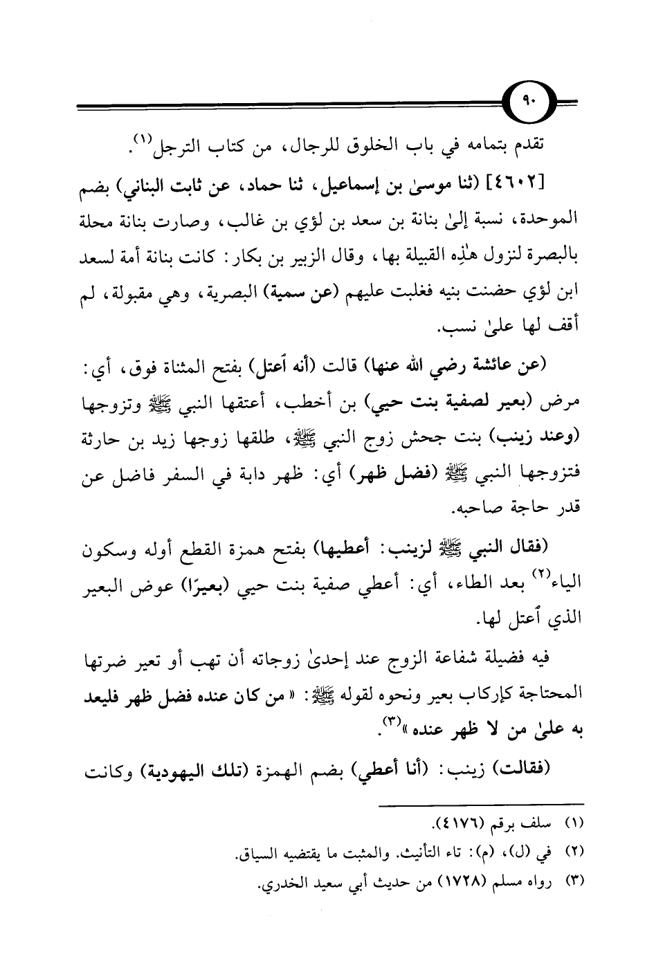 (عن عائشة رضي اللَّه عنها) قالت (أنه اعتل) بفتح المثناة فوق، أي: مرض (بعير لصفية بنت حيي) بن أخطب، أعتقها النبي -صلى اللَّه عليه وسلم- وتزوجها (وعند زينب) بنت جحش زوج النبي -صلى اللَّه عليه وسلم-، طلقها زوجها زيد بن حارثة فتزوجها النبي -صلى اللَّه عليه وسلم- (فضل ظهر) أي: ظهر دابة في السفر فاضل عن قدر حاجة صاحبه.