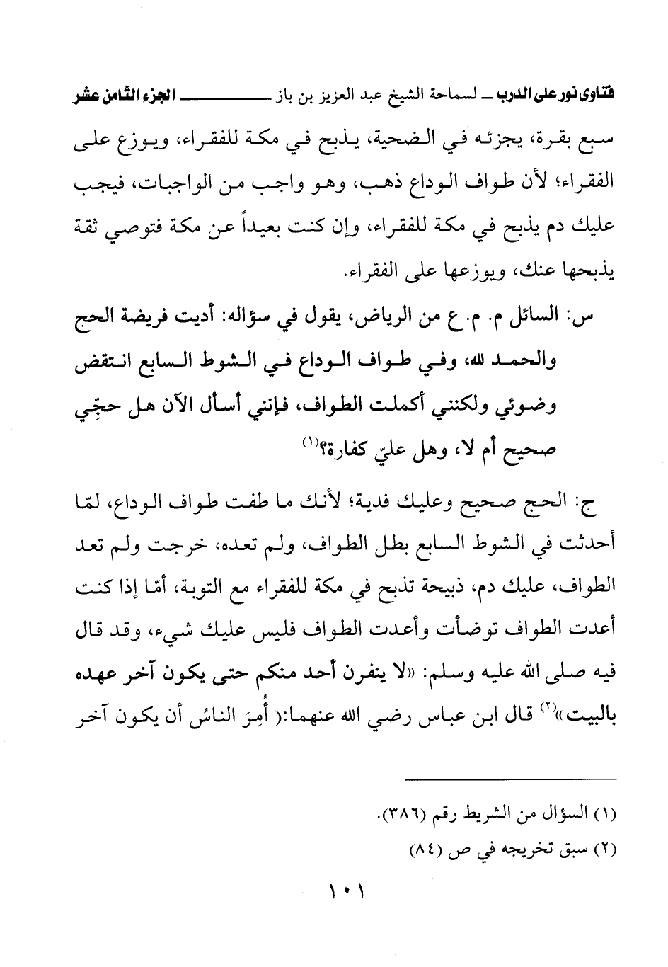 ج: الحج صحيح وعليك فدية؛ لأنك ما طفت طواف الوداع، لمّا أحدثت في الشوط السابع بطل الطواف، ولم تعده، خرجت ولم تعد الطواف، عليك دم، ذبيحة تذبح في مكة للفقراء مع التوبة، أمّا إذا كنت أعدت الطواف توضأت وأعدت الطواف فليس عليك شيء، وقد قال فيه صلى الله عليه وسلم: «لا ينفرن أحد منكم حتى يكون آخر عهده بالبيت» (¬1) قال ابن عباس رضي الله عنهما: («أُمِرَ الناسُ أن يكون آخر