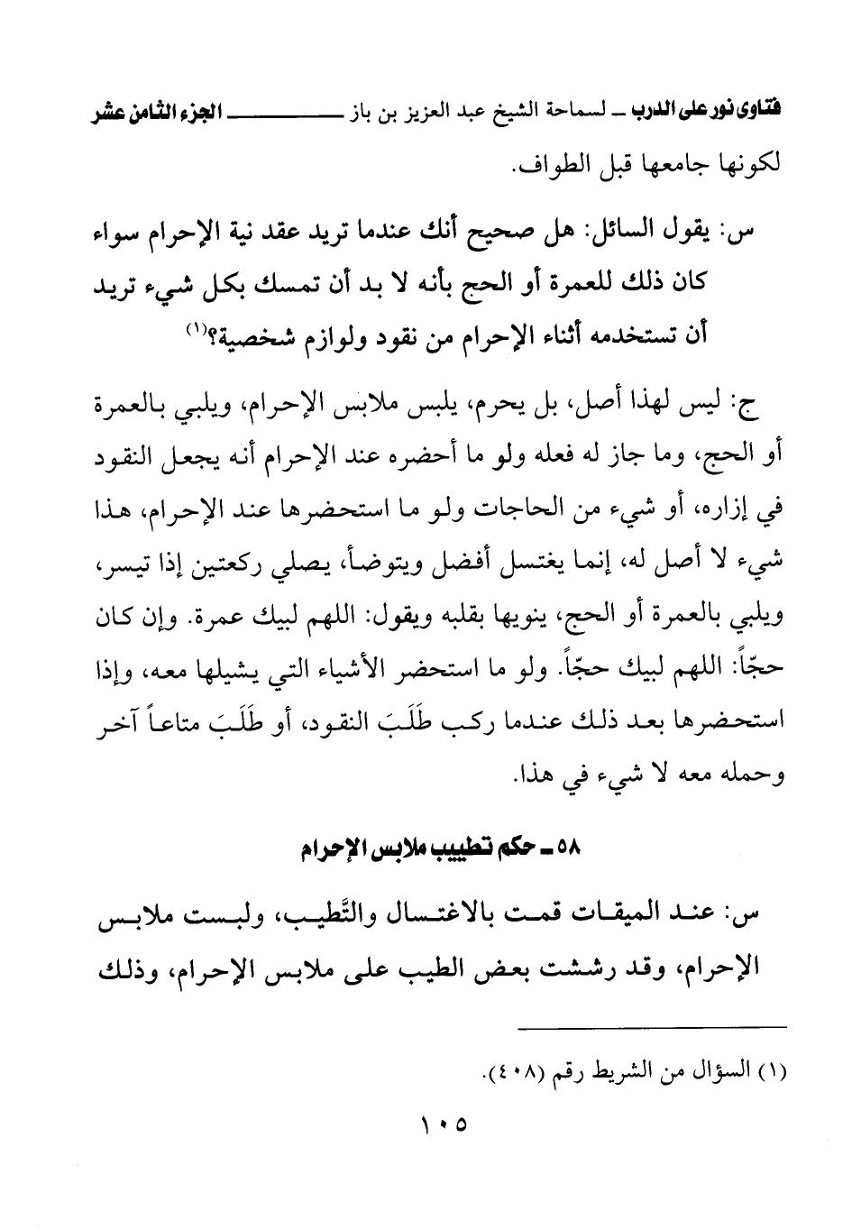 ج: ليس لهذا أصل، بل يحرم، يلبس ملابس الإحرام، ويلبي بالعمرة أو الحج، وما جاز له فعله ولو ما أحضره عند الإحرام أنه يجعل النقود في إزاره، أو شيء من الحاجات ولو ما استحضرها عند الإحرام، هذا شيء لا أصل له، إنما يغتسل أفضل ويتوضأ، يصلي ركعتين إذا تيسر، ويلبي بالعمرة أو الحج، ينويها بقلبه ويقول: اللهم لبيك عمرة. وإن كان حجًّا: اللهم لبيك حجًّا. ولو ما استحضر الأشياء التي يشيلها معه، وإذا استحضرها بعد ذلك عندما ركب طَلَبَ النقود، أو طَلَبَ متاعًا آخر وحمله معه لا شيء في هذا.