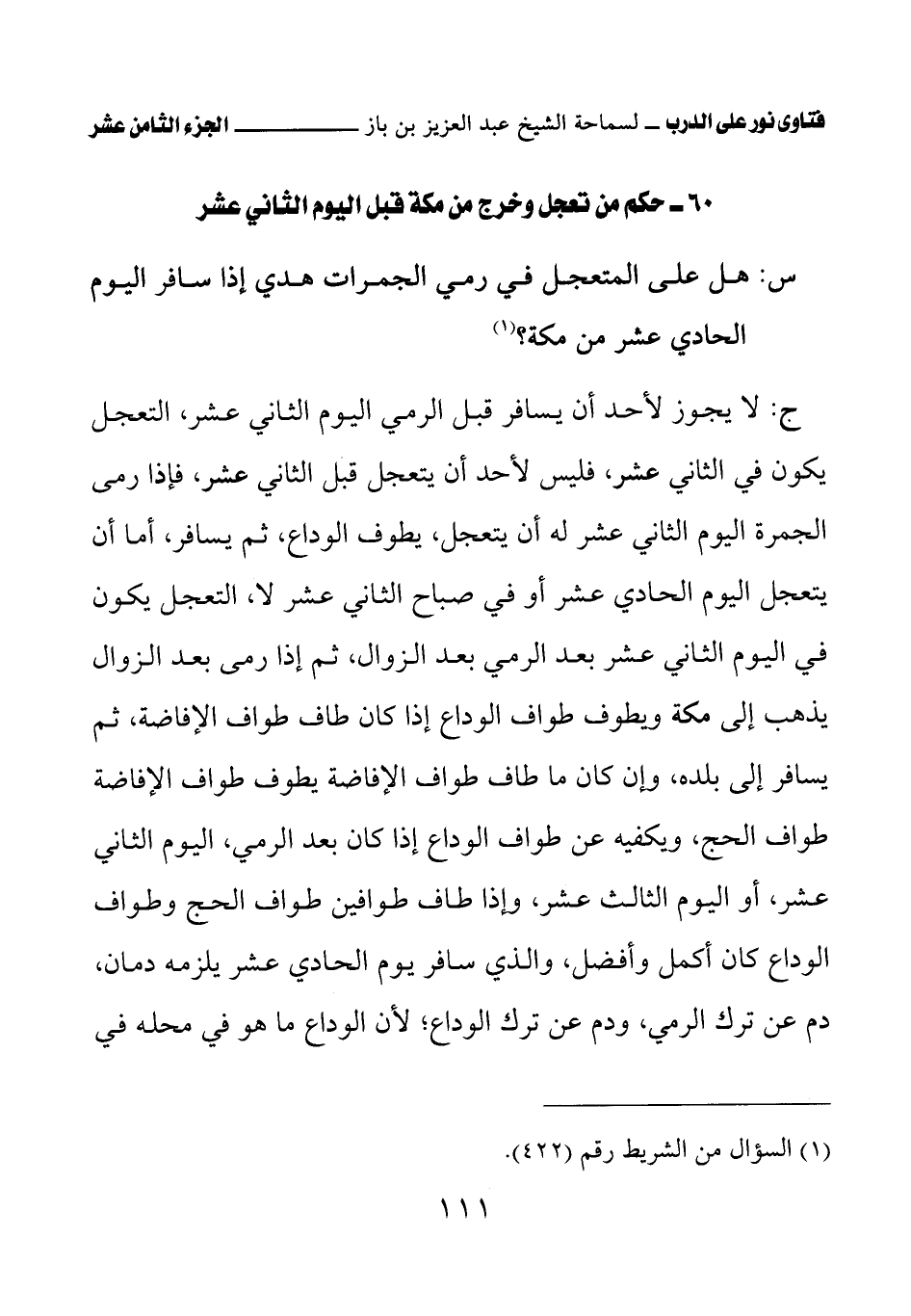 س: هل على المتعجل في رمي الجمرات هدي إذا سافر اليوم الحادي عشر من مكة؟ (¬1)