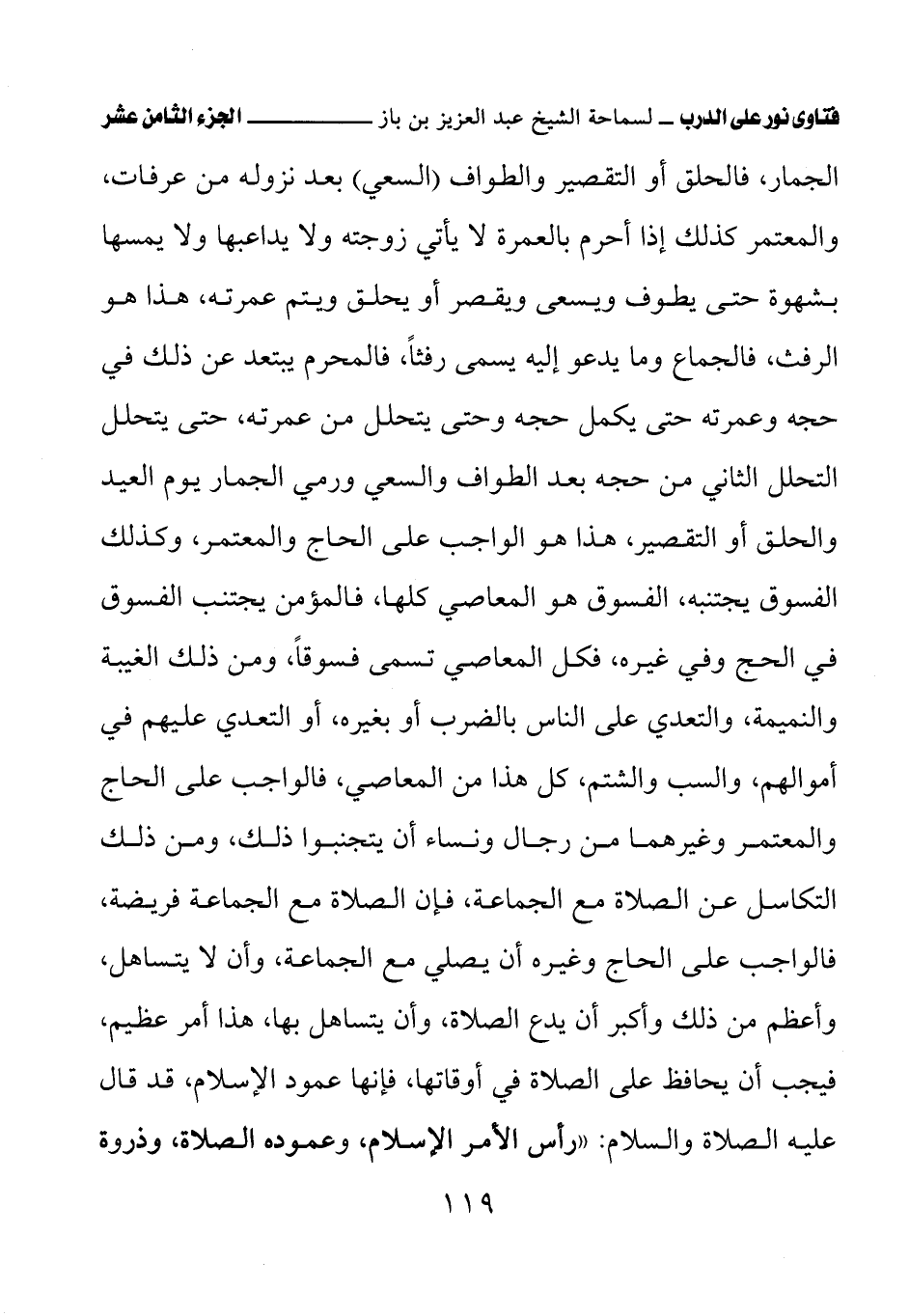 الجمار، فالحلق أو التقصير والطواف (السعي) بعد نزوله من عرفات، والمعتمر كذلك إذا أحرم بالعمرة لا يأتي زوجته ولا يداعبها ولا يمسها بشهوة حتى يطوف ويسعى ويقصر أو يحلق ويتم عمرته، هذا هو الرفث، فالجماع وما يدعو إليه يسمى رفثًا، فالمحرم يبتعد عن ذلك في حجه وعمرته حتى يكمل حجه وحتى يتحلل من عمرته، حتى يتحلل التحلل الثاني من حجه بعد الطواف والسعي ورمي الجمار يوم العيد والحلق أو التقصير، هذا هو الواجب على الحاج والمعتمر، وكذلك الفسوق يجتنبه، الفسوق هو المعاصي كلها، فالمؤمن يجتنب الفسوق في الحج وفي غيره، فكل المعاصي تسمى فسوقًا، ومن ذلك الغيبة والنميمة، والتعدي على الناس بالضرب أو بغيره، أو التعدي عليهم في أموالهم، والسب والشتم، كل هذا من المعاصي، فالواجب على الحاج والمعتمر وغيرهما من رجال ونساء أن يتجنبوا ذلك، ومن ذلك التكاسل عن الصلاة مع الجماعة، فإن الصلاة مع الجماعة فريضة، فالواجب على الحاج وغيره أن يصلي مع الجماعة، وأن لا يتساهل، وأعظم من ذلك وأكبر أن يدع الصلاة، وأن يتساهل بها، هذا أمر عظيم، فيجب أن يحافظ على الصلاة في أوقاتها، فإنها عمود الإسلام، قد قال عليه الصلاة والسلام: «رأس الأمر الإسلام، وعموده الصلاة، وذروة