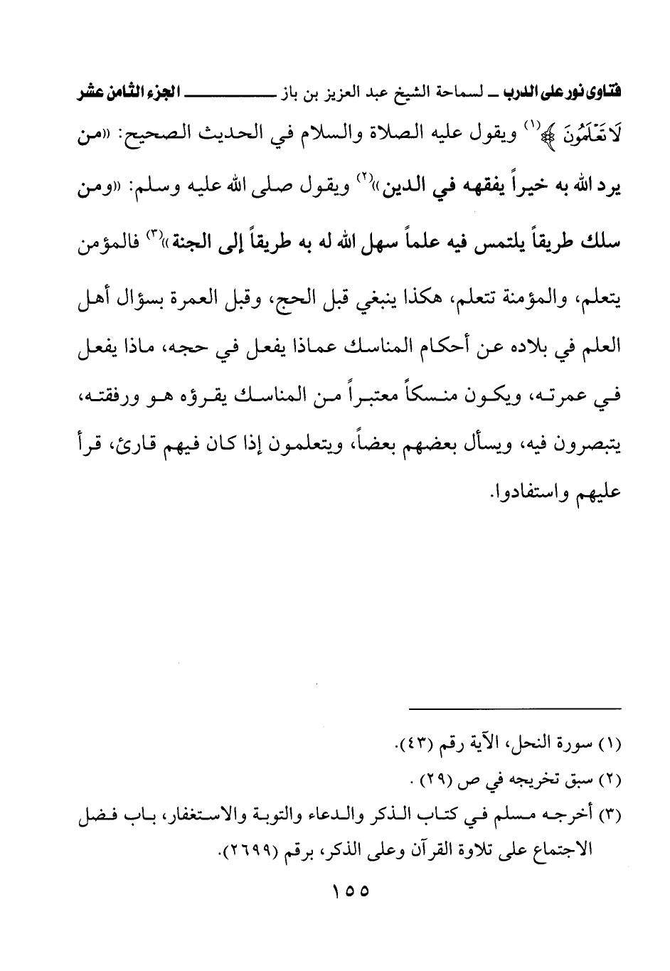 ويقول عليه الصلاة والسلام في الحديث الصحيح: «من يرد الله به خيرًا يفقهه في الدين» (¬1) ويقول صلى الله عليه وسلم: «ومن سلك طريقًا يلتمس فيه علمًا سهل الله له به طريقًا إلى الجنة» (¬2) فالمؤمن يتعلم، والمؤمنة تتعلم، هكذا ينبغي قبل الحج، وقبل العمرة بسؤال أهل العلم في بلاده عن أحكام المناسك عماذا يفعل في حجه، ماذا يفعل في عمرته، ويكون منسكًا معتبرًا من المناسك يقرؤه هو ورفقته، يتبصرون فيه، ويسأل بعضهم بعضًا، ويتعلمون إذا كان فيهم قارئ، قرأ عليهم واستفادوا.