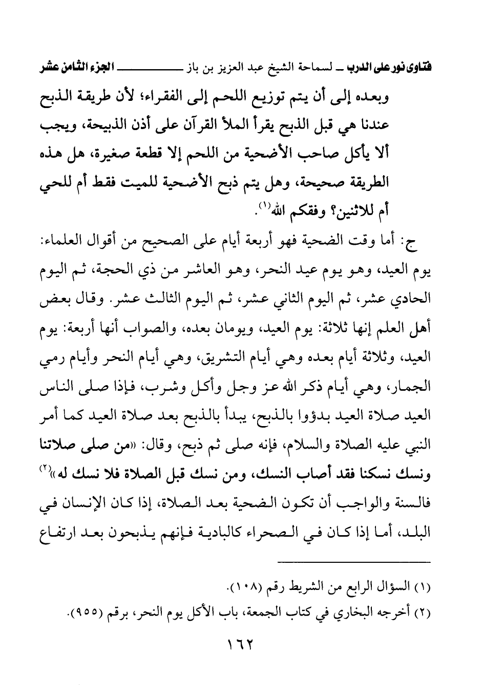 ج: أما وقت الضحية فهو أربعة أيام على الصحيح من أقوال العلماء: يوم العيد، وهو يوم عيد النحر، وهو العاشر من ذي الحجة، ثم اليوم الحادي عشر، ثم اليوم الثاني عشر، ثم اليوم الثالث عشر. وقال بعض أهل العلم إنها ثلاثة: يوم العيد، ويومان بعده، والصواب أنها أربعة: يوم العيد، وثلاثة أيام بعده وهي أيام التشريق، وهي أيام النحر وأيام رمي الجمار، وهي أيام ذكر الله عز وجل وأكل وشرب، فإذا صلى الناس العيد صلاة العيد بدؤوا بالذبح، يبدأ بالذبح بعد صلاة العيد كما أمر النبي عليه الصلاة والسلام، فإنه صلى ثم ذبح، وقال: «من صلى صلاتنا ونسك نسكنا فقد أصاب النسك، ومن نسك قبل الصلاة فلا نسك له» (¬2) فالسنة والواجب أن تكون الضحية بعد الصلاة، إذا كان الإنسان في البلد، أما إذا كان في الصحراء كالبادية فإنهم يذبحون بعد ارتفاع
