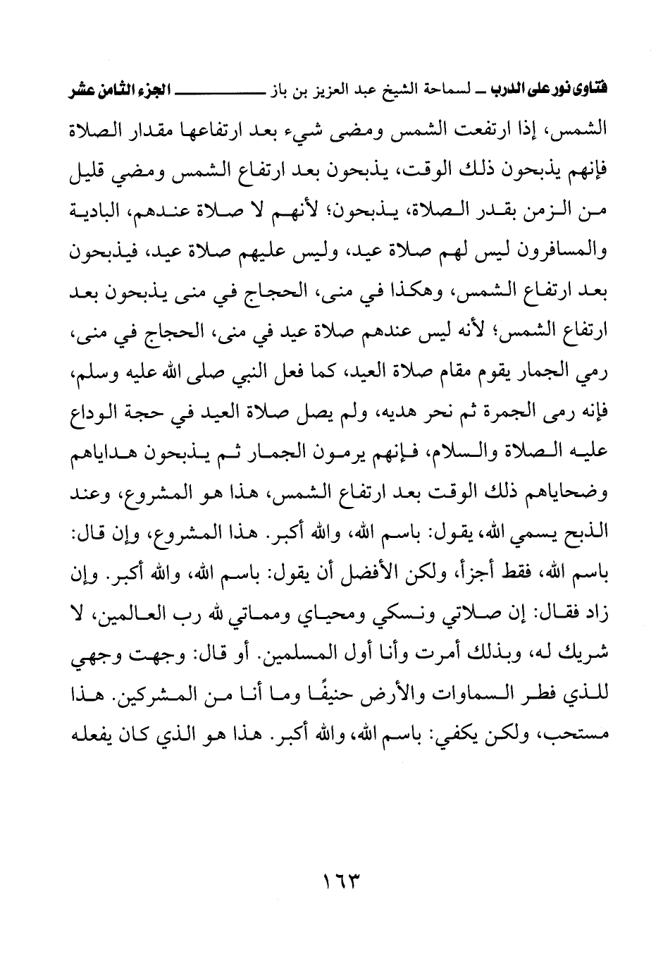 الشمس، إذا ارتفعت الشمس ومضى شيء بعد ارتفاعها مقدار الصلاة فإنهم يذبحون ذلك الوقت، يذبحون بعد ارتفاع الشمس ومضي قليل من الزمن بقدر الصلاة، يذبحون؛ لأنهم لا صلاة عندهم، البادية والمسافرون ليس لهم صلاة عيد، وليس عليهم صلاة عيد، فيذبحون بعد ارتفاع الشمس، وهكذا في منى، الحجاج في منى يذبحون بعد ارتفاع الشمس؛ لأنه ليس عندهم صلاة عيد في منى، الحجاج في منى، رمي الجمار يقوم مقام صلاة العيد، كما فعل النبي صلى الله عليه وسلم، فإنه رمى الجمرة ثم نحر هديه، ولم يصل صلاة العيد في حجة الوداع عليه الصلاة والسلام، فإنهم يرمون الجمار ثم يذبحون هداياهم وضحاياهم ذلك الوقت بعد ارتفاع الشمس، هذا هو المشروع، وعند الذبح يسمي الله، يقول: باسم الله، والله أكبر. هذا المشروع، وإن قال: باسم الله، فقط أجزأ، ولكن الأفل أن يقول: باسم الله، والله أكبر. وإن زاد فقال: إن صلاتي ونسكي ومحياي ومماتي لله رب العالمين، لا شريك له، وبذلك أمرت وأنا أول المسلمين. أو قال: وجهت وجهي للذي فطر السماوات والأرض حنيفًا وما أنا من المشركين. هذا مستحب، ولكن يكفي: باسم الله، والله أكبر. هذا هو الذي كان يفعله