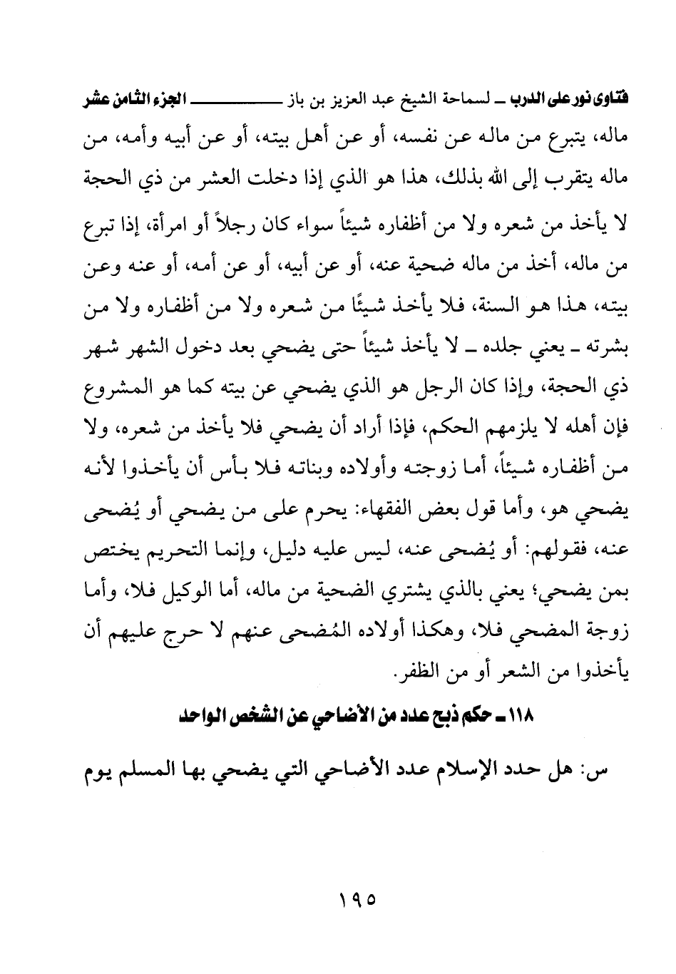ماله، يتبرع من ماله عن نفسه، أو عن أهل بيته، أو عن أبيه وأمه، من ماله يتقرب إلى الله بذلك، هذا هو الذي إذا دخلت العشر من ذي الحجة لا يأخذ من شعره، ولا من أظفاره شيئًا سواء كان رجلاً أو امرأة، إذا تبرع من ماله، أخذ من ماله ضحية عنه، أو عن أبيه، أو عن أمه، أو عنه وعن بيته، هذا هو السنة، فلا يأخذ شيئًا من شعره ولا من أظفاره ولا من بشرته - يعني جلده - لا يأخذ شيئًا حتى يضحي بعد دخول الشهر شهر ذي الحجة، وإذا كان الرجل هو الذي يضحي عن بيته كما هو المشروع فإن أهله لا يلزمهم الحكم، فإذا أراد أن يضحي فلا يأخذ من شعره، ولا من أظفاره شيئًا، أما زوجته وأولاده وبناته فلا بأس أن يأخذوا لأنه يضحي هو، وأما قول بعض الفقهاء: يحرم على من يضحي أو يُضحى عنه، فقولهم: أو يُضحى عنه، ليس عليه دليل، وإنما التحريم يختص بمن يضحي؛ يعني بالذي يشتري الضحية من ماله، أما الوكيل فلا، وأما زوجة المضحي فلا، وهكذا أولاده المُضحى عنهم لا حرج عليهم أن يأخذوا من الشعر أو من الظفر.
