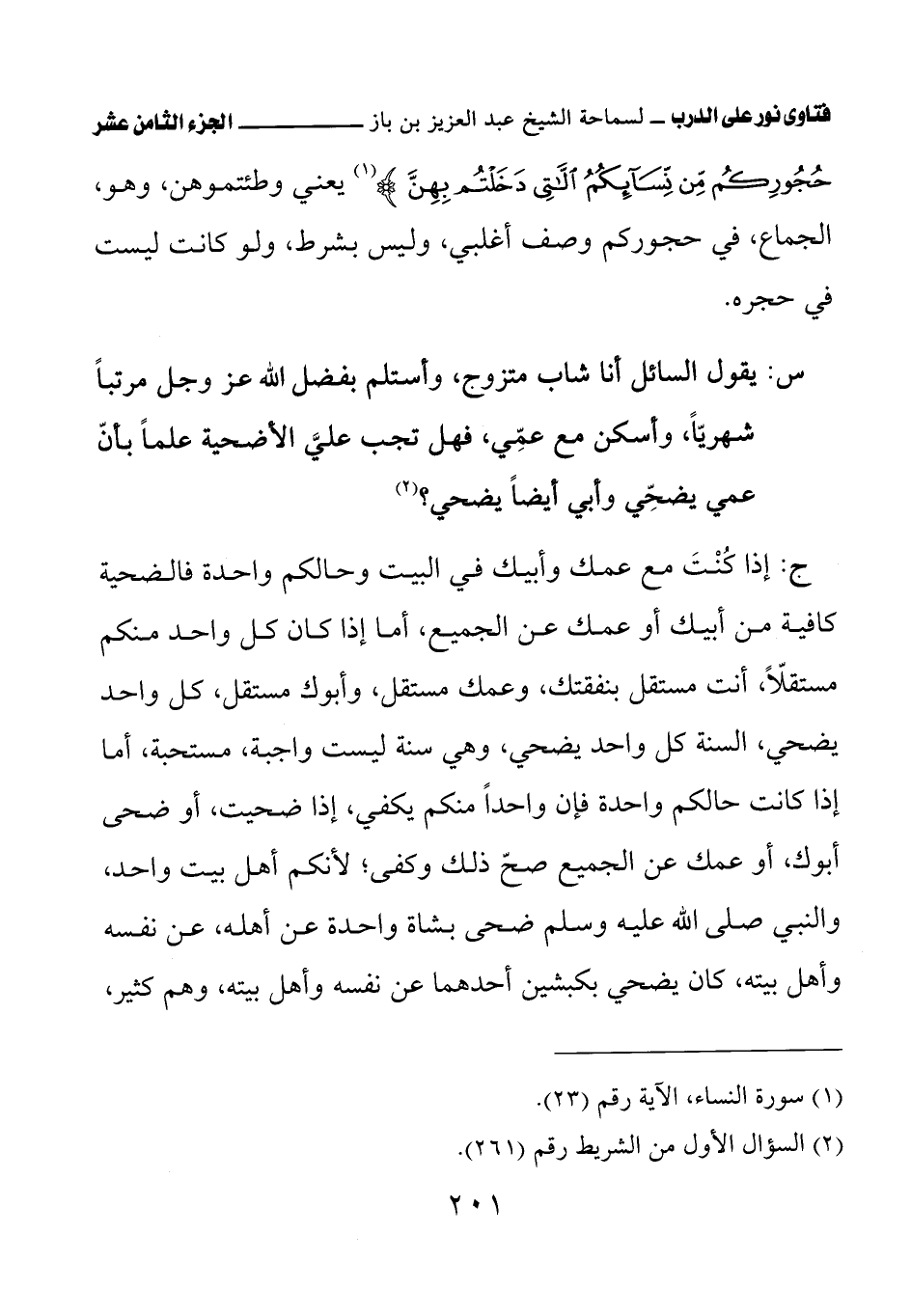 س: يقول السائل أنا شاب متزوج، وأستلم بفضل الله عز وجل مرتبًا شهريًّا، وأسكن مع عمِّي، فهل تجب عليِّ الأضحية علمًا بأنّ عمي يضحِّي وأبي أيضًا يضحي؟