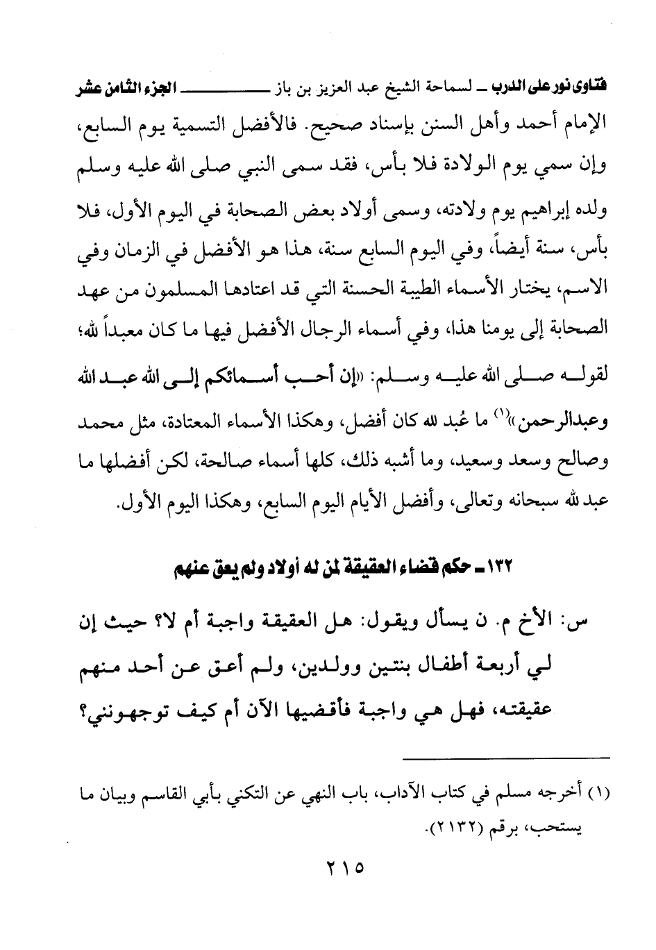 الإمام أحمد وأهل السنن بإسناد صحيح. فالأفضل التسمية يوم السابع، وإن سمي يوم الولادة فلا بأس، فقد سمى النبي صلى الله عليه وسلم ولده إبراهيم يوم ولادته، وسمى أولاد بعض الصحابة في اليوم الأول، فلا بأس، سنة أيضًا، وفي اليوم السابع سنة، هذا هو الأفضل في الزمان وفي الاسم، يختار الأسماء الطيبة التي قد اعتادها المسلمون من عهد الصحابة إلى يومنا هذا، وفي أسماء الرجال الأفضل فيها ما كان معبدًا لله؛ لقوله صلى الله عليه وسلم: «إن أحب أسمائكم إلى الله عبد الله وعبد الرحمن» (¬1) ما عُبد لله كان أفضل، وهكذا الأسماء المعتادة، مثل محمد وصالح وسعد وسعيد، وما أشبه ذلك، كلها أسماء صالحة، لكن أفضلها ما عبد لله سبحانه وتعالى، وأفضل الأيام اليوم السابع، وهكذا اليوم الأول.