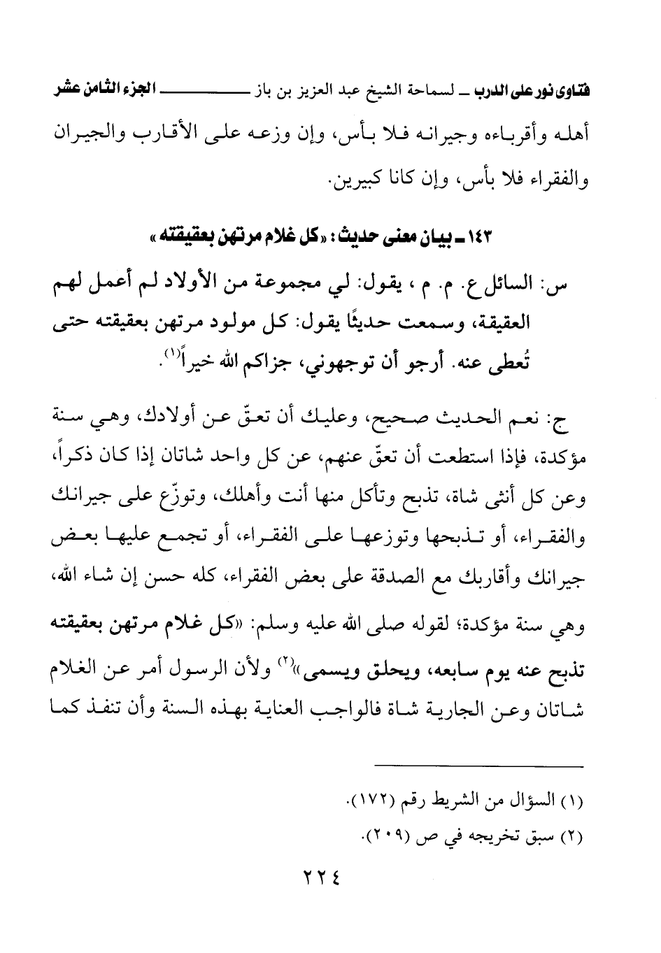 ج: نعم الحديث صحيح، وعليك أن تعقّ عن أولادك، وهي سنة مؤكدة، فإذا استطعت أن تعقّ عنهم، عن كل واحد شاتان إذا كان ذكرًا، وعن كل أنثى شاة، تذبح وتأكل منها أنت وأهلك، وتوزّع على جيرانك والفقراء، أو تذبحها وتوزعها على الفقراء، أو تجمع عليها بعض جيرانك وأقاربك مع الصدقة على بعض الفقراء، كله حسن إن شاء الله، وهي سنة مؤكدة؛ لقوله صلى الله عليه وسلم: «كل غلام مرتهن بعقيقته تذبح عنه يوم سابعه، ويحلق ويسمى» (¬3) ولأن الرسول أمر عن الغلام شاتان وعن الجارية شاة فالواجب العناية بهذه السنة وأن تنفذ كما
