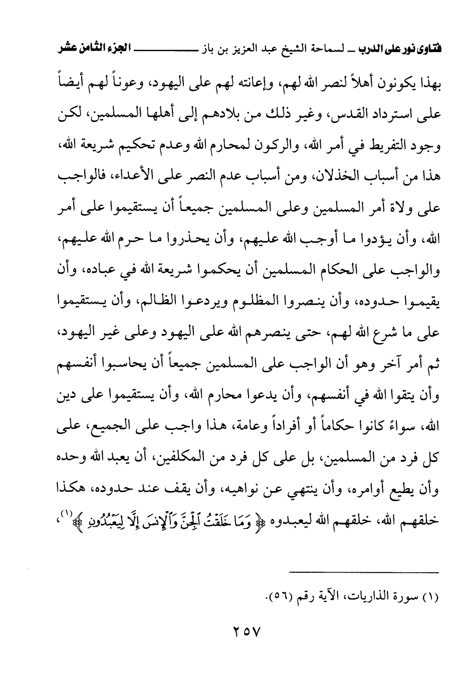 بهذا يكونون أهلاً لنصر الله لهم، وإعانته لهم على اليهود، وعونًا لهم أيضًا على استرداد القدس، وغير ذلك من بلادهم إلى أهلها المسلمين، لكن وجود التفريط في أمر الله، والركون لمحارم الله وعدم تحكيم شريعة الله، هذا من أسباب الخذلان، ومن أسباب عدم النصر على الأعداء، فالواجب على ولاة أمر المسلمين وعلى المسلمين جميعًا أن يستقيموا على أمر الله، وأن يؤدوا ما أوجب الله عليهم، وأن يحذروا ما حرم الله عليهم، والواجب على الحكام المسلمين جميعًا أن يحكموا شريعة الله في عباده، وأن يقيموا حدوده، وأن ينصروا المظلوم ويردعوا الظالم، وأن يستقيموا على ما شرع الله لهم، حتى ينصرهم الله على اليهود وعلى غير اليهود، ثم أمر آخر وهو أن الواجب على المسلمين جميعًا أن يحاسبوا أنفسهم وأن يتقوا الله في أنفسهم، وأن يدعوا محارم الله، وأن يستقيموا على دين الله، سواء كانوا حكامًا أو أفرادًا وعامة، هذا واجب على الجميع، على كل فرد من المسلمين، بل على كل فرد من المكلفين، أن يعبد الله وحده وأن يطيع أوامره، وأن ينتهي عن نواهيه، وأن يقف عند حدوده، هكذا خلقهم الله، خلقهم الله ليعبدوه {وَمَا خَلَقْتُ الْجِنَّ وَالْإِنْسَ إِلاَّ لِيَعْبُدُونِ}،