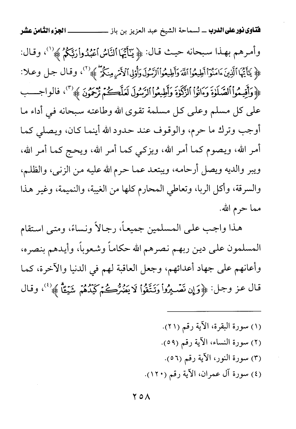 هذا واجب على المسلمين جميعًا، رجالاً ونساءً، ومتى استقام المسلمون على دين ربهم نصرهم الله حكامًا وشعوبًا، وأيدهم بنصره وأعانهم على جهاد أعدائهم، وجعل العاقبة لهم في الدنيا والآخرة، كما قال عز وجل: {وَإِنْ تَصْبِرُوا وَتَتَّقُوا لاَ يَضُرُّكُمْ كَيْدُهُمْ شَيْئًا}، وقال