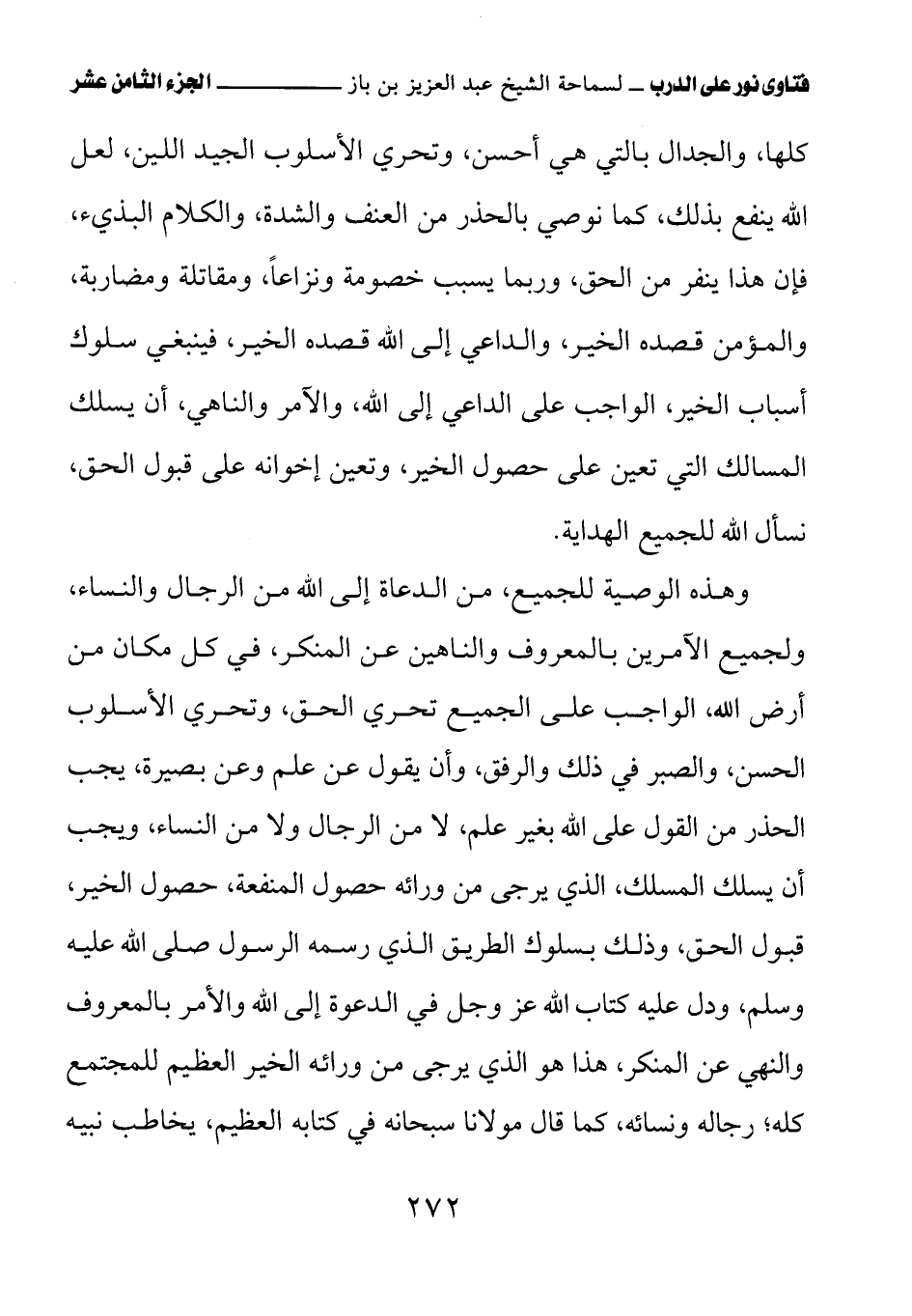 وهذه الوصية للجميع، من الدعاة إلى الله من الرجال والنساء، ولجميع الآمرين بالمعروف والناهين عن المنكر، في كل مكان من أرض الله، الواجب على الجميع تحري الحق، وتحري الأسلوب الحسن، والصبر في ذلك والرفق، وأن يقول عن علم وعن بصيرة، يجب الحذر من القول على الله بغير علم، لا من الرجال ولا من النساء، ويجب أن يسلك المسلك الذي يرجى من ورائه حصول المنفعة، حصول الخير، قبول الحق، وذلك بسلوك الطريق الذي رسمه الرسول صلى الله عليه وسلم، ودل عليه كتاب الله عز وجل في الدعوة إلى الله والأمر بالمعروف والنهي عن المنكر، هذا هو الذي يرجى من ورائه الخير العظيم للمجتمع كله؛ رجاله ونسائه، كما قال مولانا سبحانه في كتابه العظيم، يخاطب نبيه