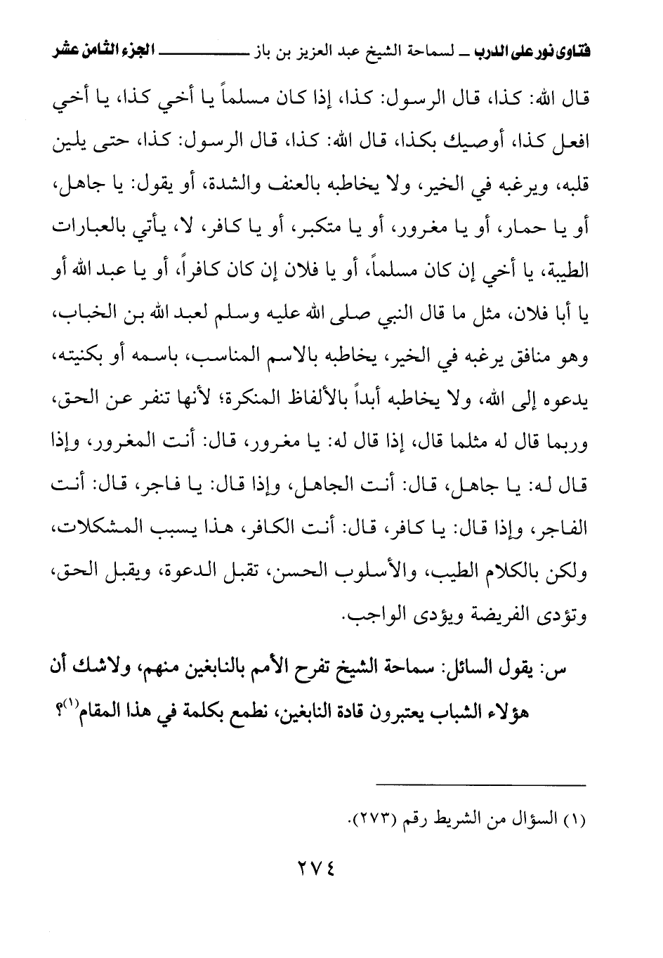 قال الله: كذا، قال الرسول: كذا، إذا كان مسلمًا يا أخي كذا، يا أخي افعل كذا، أوصيك بكذا، قال الله: كذا، قال الرسول: كذا، حتى يلين قلبه، ويرغبه في الخير، ولا يخاطبه بالعنف والشدة، أو يقول: يا جاهل، أو يا حمار، أو يا مغرور، أو يا متكبر، أو يا كافر، لا، يأتي بالعبارات الطيبة، يا أخي إن كان مسلمًا، أو يا فلان إن كان كافرًا، أو يا عبد الله أو يا أبا فلان، مثل ما قال النبي صلى الله عليه وسلم لعبد الله بن الخباب، وهو منافق يرغبه في الخير، يخاطبه بالاسم المناسب، باسمه أو بكنيته، يدعوه إلى الله، ولا يخاطبه أبدًا بالألفاظ المنكرة؛ لأنها تنفر عن الحق، وربما قال له مثلما قال، إذا قال له: يا مغرور، قال: أنت المغرور، وإذا قال له: يا جاهل، قال: أنت الجاهل، وإذا قال: يا فاجر، قال: أنت الفاجر، وإذا قال: يا كافر، قال: أنت الكافر، هذا يسبب المشكلات، ولكن بالكلام الطيب، والأسلوب الحسن، تقبل الدعوة، ويقبل الحق، وتؤدى الفريضة ويؤدى الواجب.