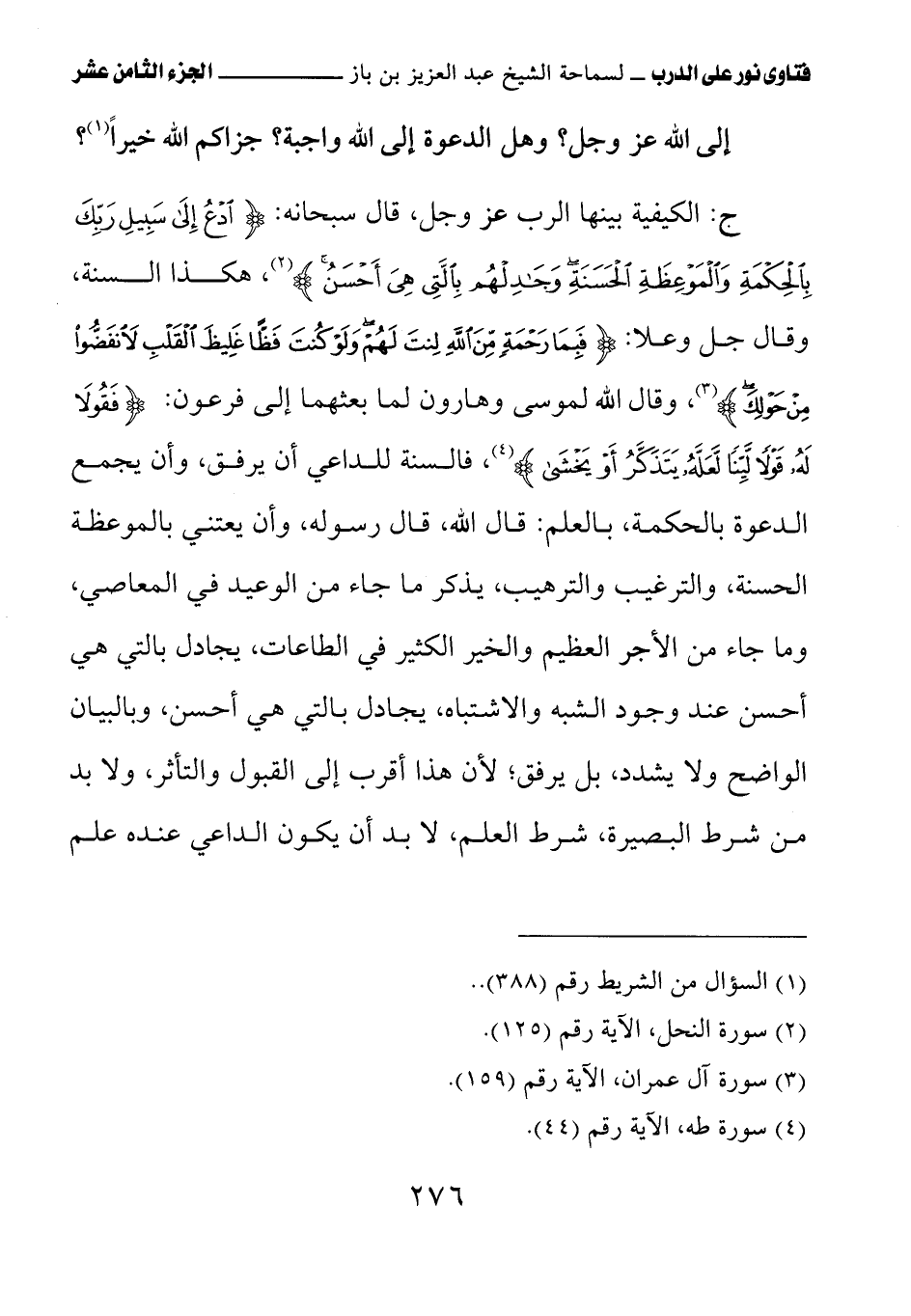 ج: الكيفية بينها الرب عز وجل، قال سبحانه: {ادْعُ إِلَى سَبِيلِ رَبِّكَ بِالْحِكْمَةِ وَالْمَوْعِظَةِ الْحَسَنَةِ وَجَادِلْهُمْ بِالَّتِي هِيَ أَحْسَنُ}، هكذا السنة، وقال جل وعلا: {فَبِمَا رَحْمَةٍ مِنَ اللَّهِ لِنْتَ لَهُمْ وَلَوْ كُنْتَ فَظًّا غَلِيظَ الْقَلْبِ لاَنْفَضُّوا مِنْ حَوْلِكَ}، وقال الله لموسى وهارون لما بعثهما إلى فرعون: {فَقُولاَ لَهُ قَوْلاً لَيِّنًا لَعَلَّهُ يَتَذَكَّرُ أَوْ يَخْشَى}، فالسنة للداعي أن يرفق، وأن يجمع الدعوة بالحكمة، بالعلم: قال الله، قال رسوله، وأن يعتني بالموعظة الحسنة، والترغيب والترهيب، يذكر ما جاء من الوعيد في المعاصي، وما جاء من الأجر العظيم والخير الكثير في الطاعات، يجادل بالتي هي أحسن عند وجود الشبه والاشتباه، يجادل بالتي هي أحسن، وبالبيان الواضح ولا يشدد، بل يرفق؛ لأن هذا أقرب إلى القبول والتأثر، ولا بد من شرط البصيرة، شرط العلم، لا بد أن يكون الداعي عنده علم
