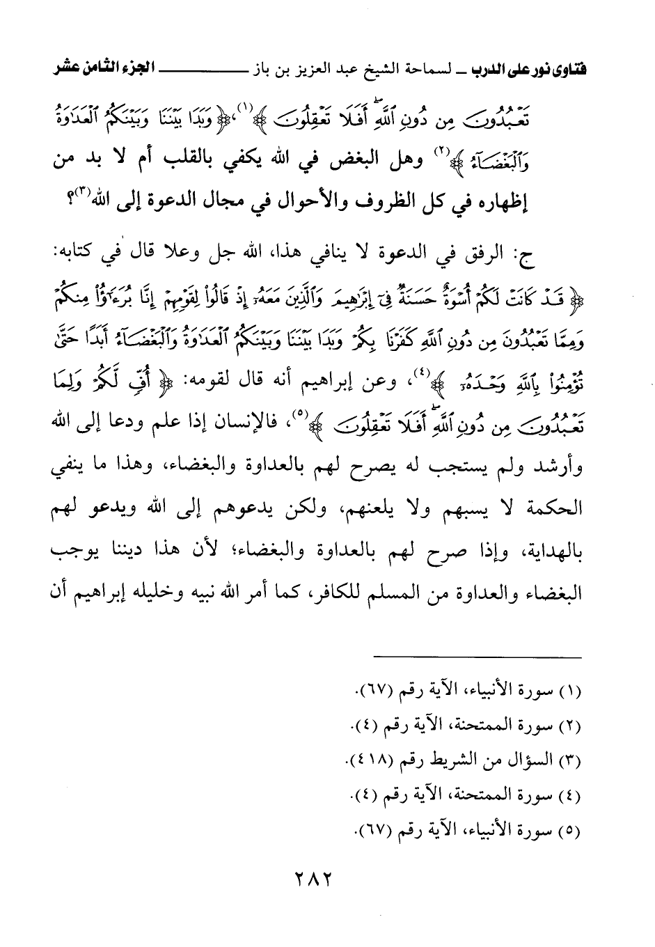{أُفٍّ لَكُمْ وَلِمَا تَعْبُدُونَ مِنْ دُونِ اللَّهِ أَفَلاَ تَعْقِلُونَ}، {وَبَدَا بَيْنَنَا وَبَيْنَكُمُ الْعَدَاوَةُ وَالْبَغْضَاءُ} وهل البغض في الله يكفي بالقلب أم لا بد من إظهاره في كل الظروف والأحوال في مجال الدعوة إلى الله؟ (¬1)